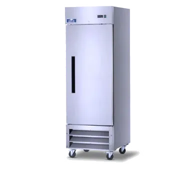 Elevate cooling precision with the Arctic Air AR23 Refrigerator Reach-In for commercial restaurants. This one-section refrigerator offers a 23.0 cu. ft. capacity and features an electronic thermostat with a digital LED display to monitor and adjust the temperature, keeping food fresh between 33F to 41F. The solid hinged self-closing door ensures security with a lock and offers convenient loading and unloading with a remain open feature. A removable magnetic door gasket ensures an airtight seal, and the stainless steel front and sides provide durability and a sleek look. Inside, find three adjustable wire shelves and a white aluminum interior with a stainless steel floor for easy organization and cleaning. The bottom-mounted self-contained refrigeration system, powered by a 1/5 HP motor, cools efficiently with minimal noise. Equipped with four 6" casters, including two locking ones, this refrigerator is mobile and simple to position. It also uses environmentally friendly R290 Hydrocarbon refrigerant. Trust the Arctic Air AR23 Refrigerator Reach-In for your commercial refrigeration needs.