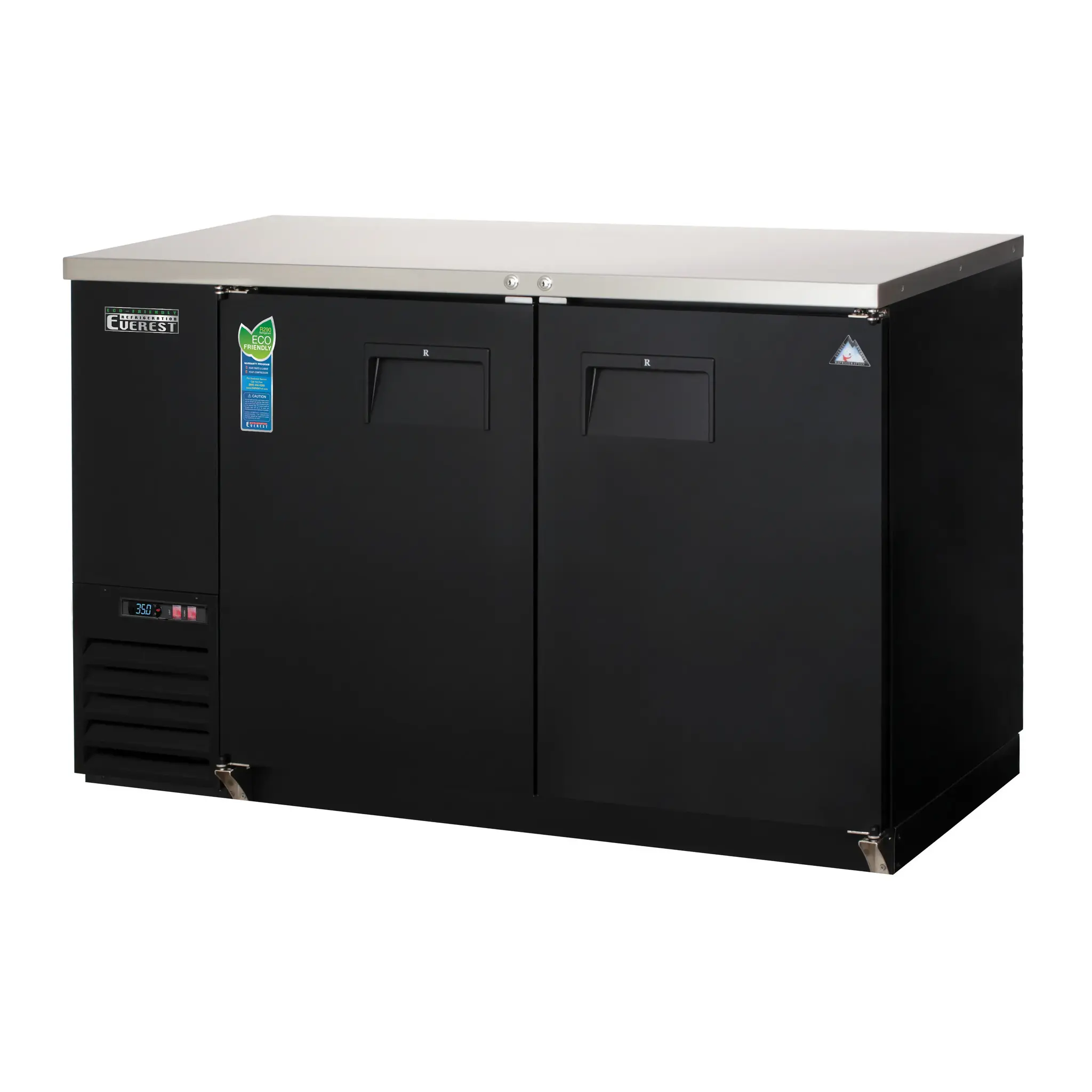 Discover kitchen perfection with the Everest Refrigeration EBB59-24 Back Bar Cabinet. This two-section refrigerator is designed to meet the needs of commercial restaurants, offering a spacious 17.0 cu. ft. capacity that can hold up to 560 12 oz. cans or 357 12 oz. bottles. The self-contained side mounted refrigeration ensures efficient cooling, while the stainless steel countertop provides a durable and easy-to-clean surface. With two solid hinged doors that lock for added security, you can trust that your beverages are safe and secure. The four epoxy coated wire shelves allow for organized storage, and the digital controls with LED display make it easy to adjust and monitor the temperature. The auto defrost feature saves you time and effort, while the LED interior lighting with on/off switch enhances visibility. The textured and laminated black vinyl exterior adds a sleek and professional look to your restaurant, while the galvanized steel interior wall and stainless steel floor ensure long-lasting durability. With R290 Hydrocarbon refrigerant and a 1/4 HP compressor, this back bar cabinet is both energy-efficient and environmentally friendly. NSF and ETL-Sanitation certified, this Everest Refrigeration EBB59-24 Back Bar Cabinet is the perfect addition to any commercial restaurant.