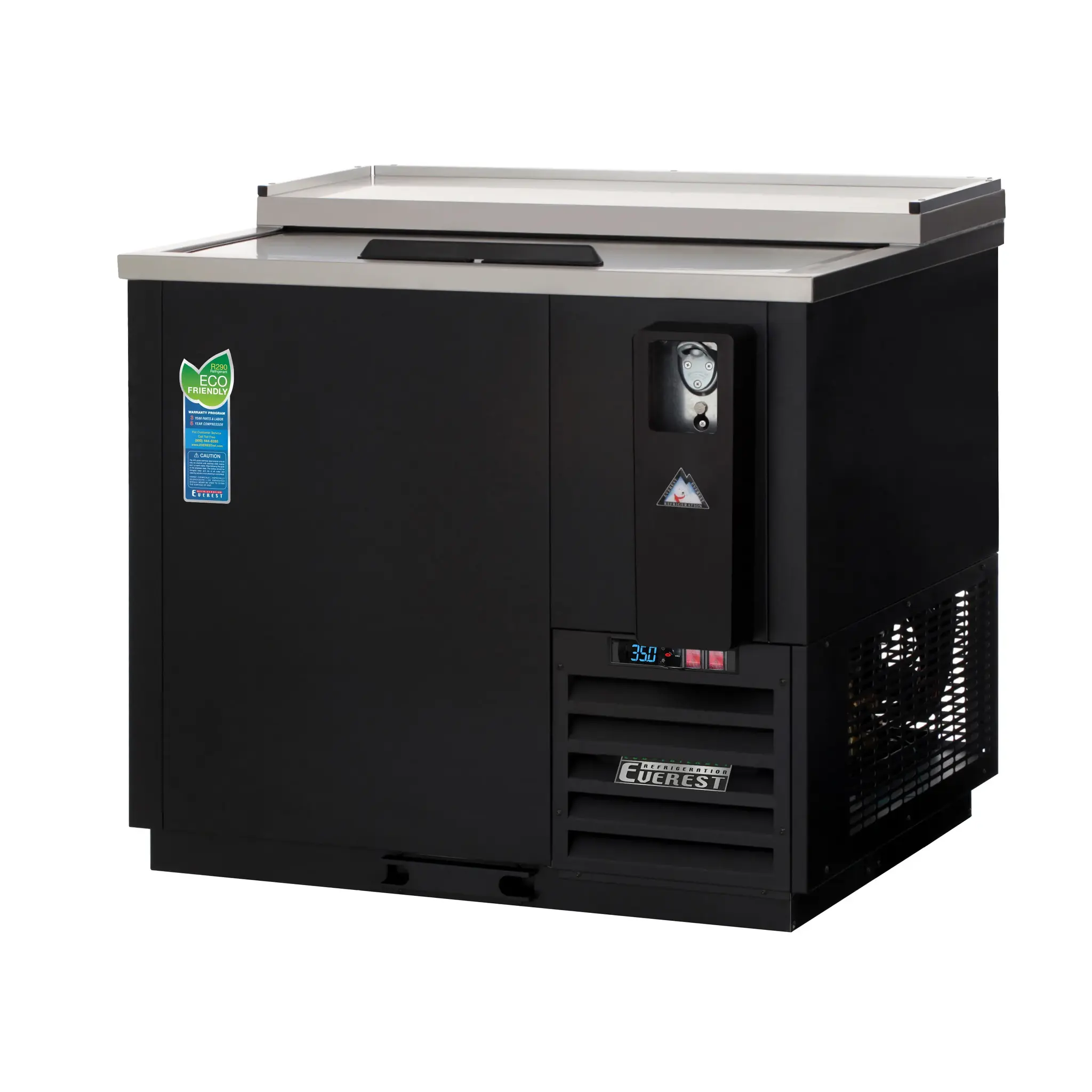 Enhance your commercial kitchen with the Everest Refrigeration EBC37 Bottle Cooler. This horizontal bottle cooler is designed to meet the needs of busy restaurants, offering a spacious 11.0 cu. ft. capacity that can hold up to 348 12 oz. cans or 264 12 oz. bottles. The self-contained side mounted refrigeration ensures efficient cooling, while the stainless steel countertop provides a durable and easy-to-clean surface. The cooler features a stainless steel sliding lid with a locking mechanism, as well as two epoxy coated bin dividers and a removable bottle cap opener and catcher for added convenience. With digital controls and LED display, you can easily adjust the temperature to suit your needs. The auto defrost feature and LED interior lighting with on/off switch further enhance the functionality of this bottle cooler. Its textured and laminated black vinyl exterior adds a sleek and professional look to any commercial kitchen. Made with galvanized steel interior and R290 Hydrocarbon refrigerant, this bottle cooler is built to last. With a 1/4 HP motor and 115v/60/1-ph power supply, it delivers reliable performance. NSF and cETLus certified, as well as ETL-Sanitation listed, this bottle cooler meets the highest standards of quality and safety. Upgrade your restaurant's beverage service with the Everest Refrigeration EBC37 Bottle Cooler.
