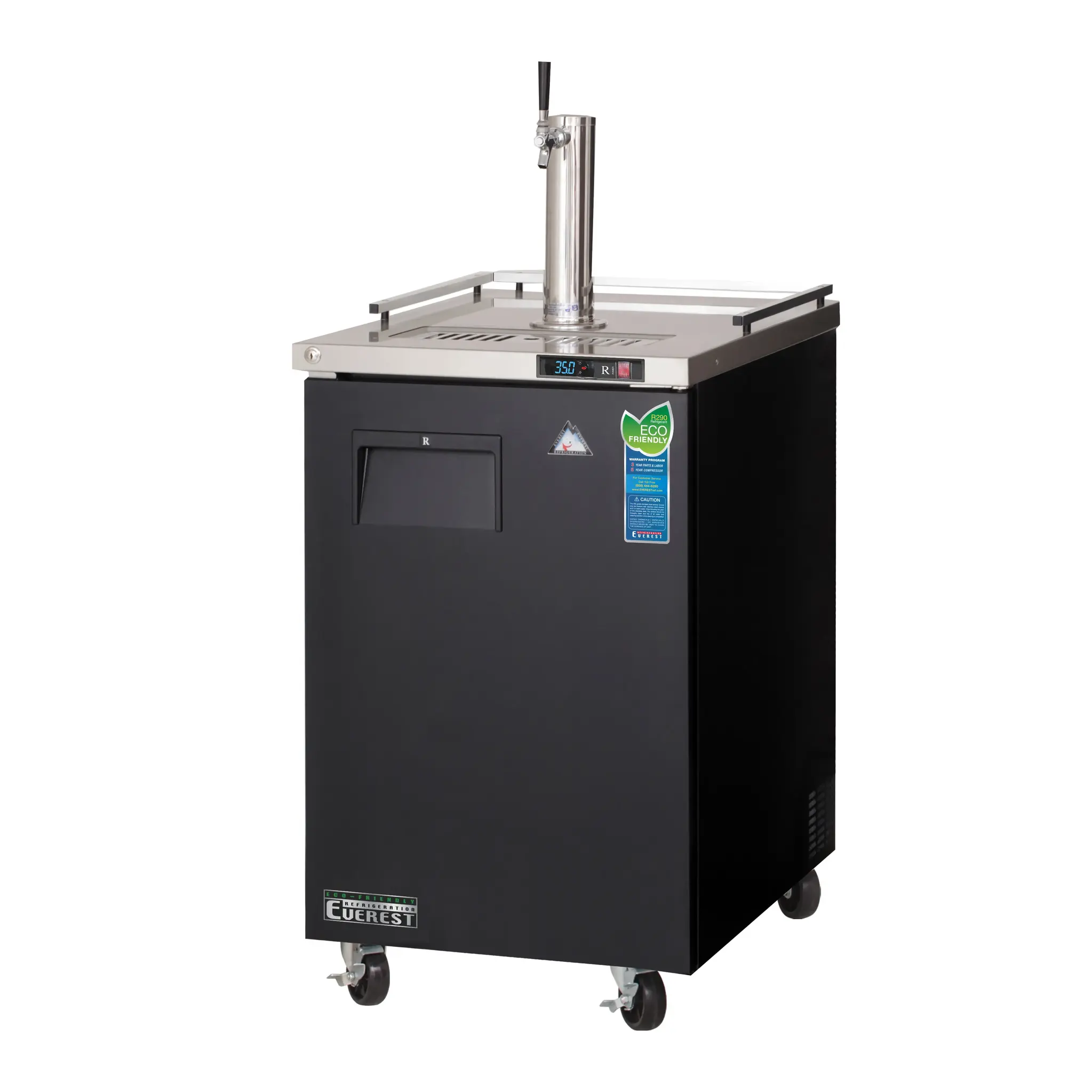 Take your kitchen to the next level with the Everest Refrigeration EBD1 Draft Beer Cooler. This one-section direct draw keg refrigerator is designed to meet the needs of commercial restaurants. With a capacity of 8.0 cu. ft., it can hold one 1/2 barrel keg, ensuring you always have a cold and refreshing beer on tap. The solid hinged door, equipped with a lock, provides security for your keg. The stainless steel countertop and rail offer a durable and easy-to-clean surface, while the digital controls with LED display make it simple to adjust the temperature. The auto defrost feature and LED interior lighting add convenience to your operation. Made with textured and laminated black vinyl exterior, galvanized steel interior wall, and stainless steel floor, this draft beer cooler is built to last. It uses R290 Hydrocarbon refrigerant and has a 1/5 HP compressor, ensuring energy efficiency. NSF and ETL-Sanitation certified, this Everest Refrigeration EBD1 Draft Beer Cooler is a reliable and high-quality addition to any commercial kitchen.