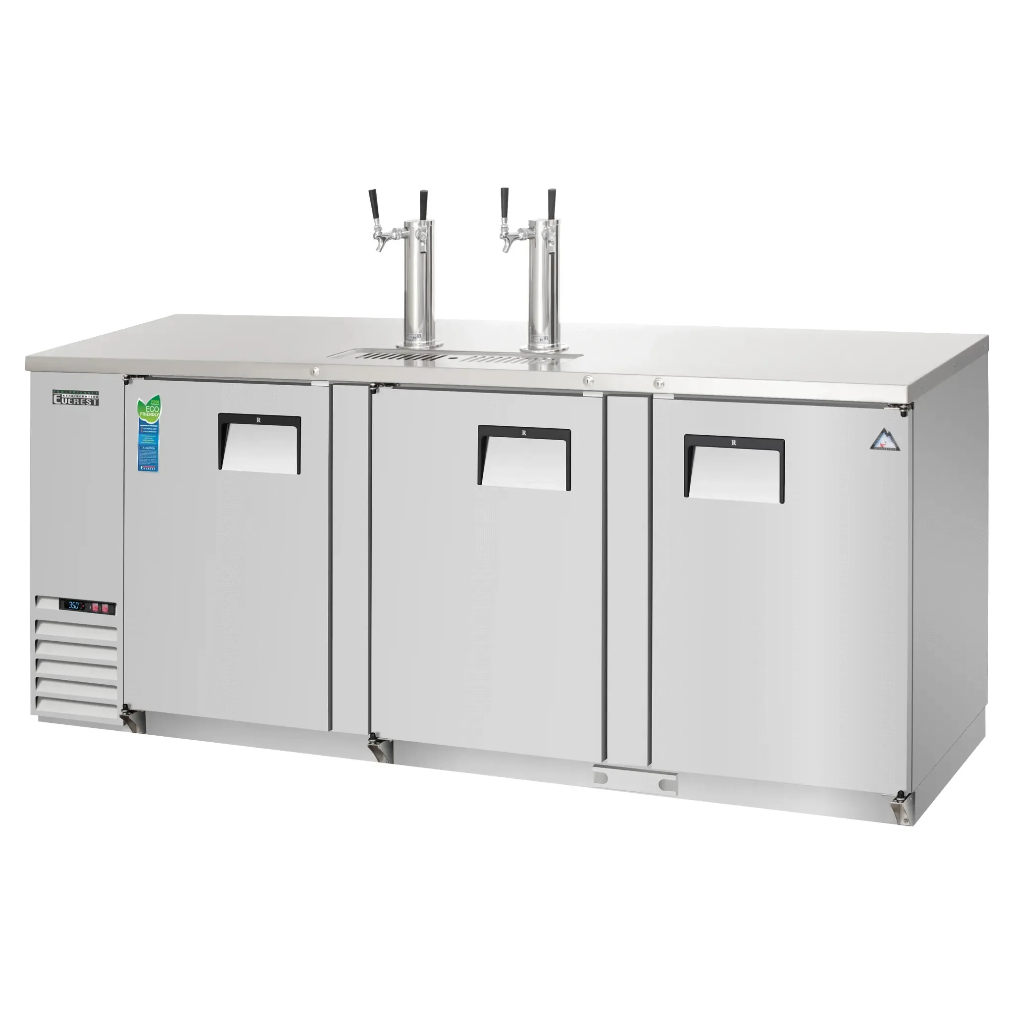 Introducing the Everest Refrigeration EBD4-SS Draft Beer Cooler, designed to drive restaurant profitability. This three-section cooler boasts a spacious 32.0 cu. ft. capacity, perfect for storing and serving multiple kegs simultaneously. With its solid hinged doors, snap-in magnetic door gasket, and locking feature, you can rest assured that your kegs are secure and the temperature is maintained. The EBD4-SS comes equipped with two 3" diameter insulated stainless steel draft towers, each featuring two faucets, allowing for efficient and convenient pouring. The digital controls with LED display make it easy to adjust the temperature, which ranges from 33F to 54F, ensuring your beer is always served at the perfect temperature. The LED interior lighting not only enhances visibility but also adds a touch of sophistication to your bar area. With its stainless exterior and galvanized steel interior, this draft beer cooler is not only durable but also easy to clean. The self-contained side-mounted refrigeration system, utilizing R290 Hydrocarbon refrigerant, ensures efficient cooling while minimizing energy consumption. The overheat protection alarm for the compressor and condenser coil provides an added layer of safety. NSF and ETL-Sanitation certified, this Everest Refrigeration EBD4-SS Draft Beer Cooler is a reliable and essential addition to any commercial restaurant.