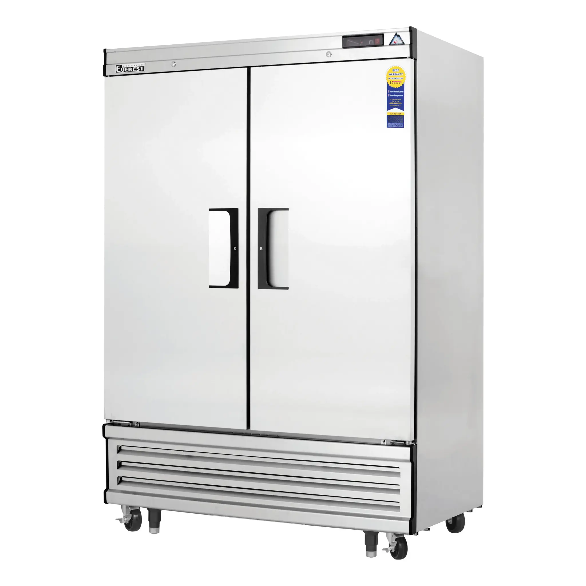 Invest in superior quality with the Everest Refrigeration EBF2 Freezer, Reach-In. This two-section reach-in freezer is designed to meet the demands of a busy commercial restaurant. With a spacious 50.0 cu. ft. capacity, it provides ample storage space for all your frozen ingredients and prepared dishes. The self-contained bottom mounted refrigeration ensures efficient cooling and easy maintenance. The two full-height solid hinged self-closing doors come with locking mechanisms for added security. Inside, you'll find six epoxy coated wire shelves with height adjustable clips, allowing you to customize the storage layout to suit your needs. The digital controls with LED display make it easy to monitor and adjust the temperature settings. The auto defrost feature saves you time and effort, while the LED interior lighting provides clear visibility of the contents. The stainless steel interior, front, and sides ensure durability and easy cleaning. With its 1 HP motor and 115v/60/1-ph power supply, this freezer is built to handle the demands of a commercial kitchen. Invest in the Everest Refrigeration EBF2 Freezer, Reach-In, and experience the convenience and reliability it brings to your restaurant.