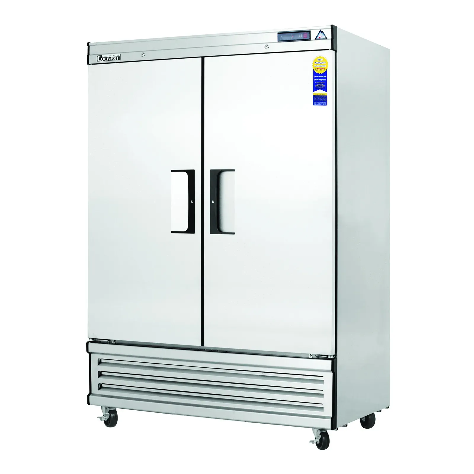 Fuel your restaurant's success with the Everest Refrigeration EBSF2 Reach-In Freezer. This two-section freezer is designed to meet the demands of a busy commercial kitchen. With a spacious 48.0 cu. ft. capacity, it provides ample storage space for all your frozen ingredients and prepared dishes. The self-contained bottom mounted refrigeration system ensures efficient cooling and easy maintenance. The two full-height solid hinged self-closing doors are equipped with locks for added security. Inside, you'll find six epoxy coated wire shelves with height adjustable clips, allowing you to customize the storage space to suit your needs. The digital controls with LED display make it easy to monitor and adjust the temperature. The auto defrost feature saves you time and effort, while the LED interior lighting provides clear visibility of the contents. The stainless steel interior, front, and sides ensure durability and easy cleaning. With its 1 HP motor and 115v/60/1-ph power supply, this freezer is built to handle the demands of a commercial kitchen. Trust Everest Refrigeration to deliver reliable and high-quality refrigeration solutions for your restaurant.