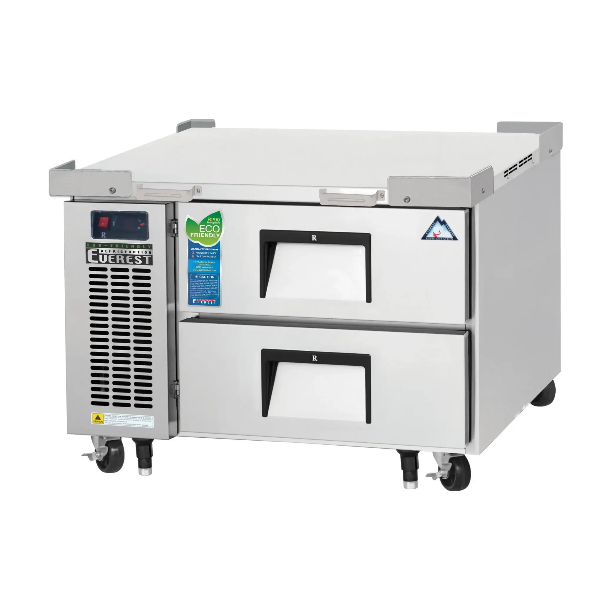 Maximize your food service potential with the Everest Refrigeration ECB36D2 Equipment Stand. This chef base refrigerator is designed to meet the demands of a busy commercial restaurant. With its one-section design and two heavy-duty stainless steel drawers, it offers ample storage space for your ingredients and supplies. The 16 gauge stainless steel worktop provides a durable and hygienic surface for food preparation. The digital controls with LED display make it easy to monitor and adjust the temperature, while the auto defrost feature ensures hassle-free maintenance. The dual air chamber and vents, along with the high heat insulation, help to maintain optimal temperature and prevent food spoilage. The stainless steel interior and exterior, as well as the galvanized steel bottom and rear, ensure long-lasting durability. With a weight capacity of 717 lbs., this chef base refrigerator can handle even the busiest of kitchens. Trust Everest Refrigeration to deliver reliable and efficient refrigeration solutions for your commercial restaurant.