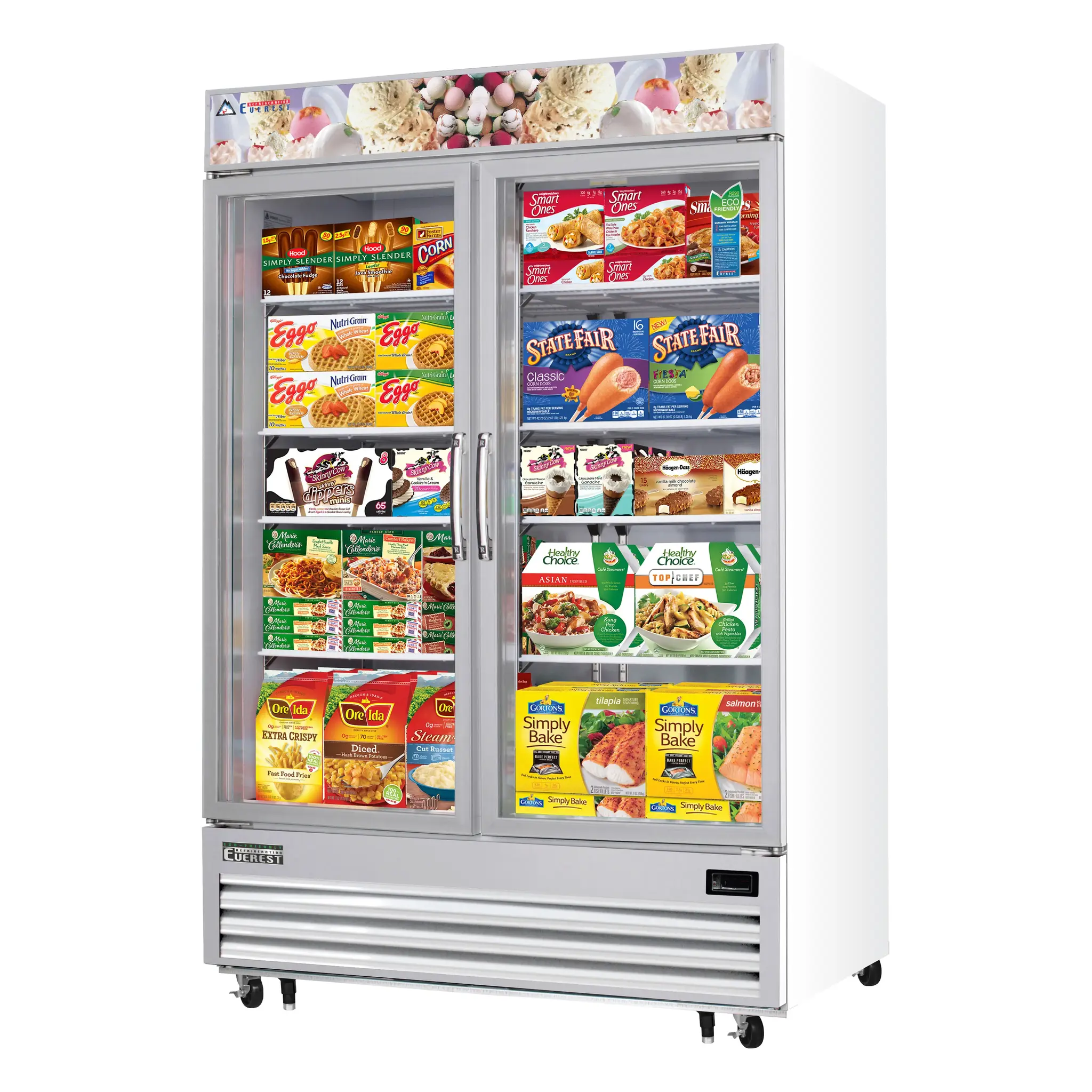 Enhance the heart of your restaurant with the Everest Refrigeration EMGF48 Freezer Merchandiser. This two-section reach-in glass door freezer is designed to meet the needs of busy commercial kitchens. With a spacious 48.0 cu. ft. capacity and eight epoxy coated wire shelves, you'll have plenty of room to store and display your frozen goods. The self-contained bottom mounted refrigeration system ensures efficient cooling and easy maintenance. The two glass hinged self-closing doors are equipped with locks for added security. The digital controls with LED display allow for precise temperature adjustments, while the hot gas defrost system ensures optimal performance. The LED interior lighting with an on/off switch provides excellent visibility, and the pressure relief valve prevents any potential build-up. The matte finish aluminum door frame, white coated steel interior and exterior, and stainless steel floor ensure durability and easy cleaning. With two leg stabilizers and a 1 HP motor, this freezer merchandiser is built to withstand the demands of a commercial restaurant. NSF and ETL-Sanitation certified, this Everest Refrigeration EMGF48 Freezer Merchandiser is a reliable and efficient addition to any commercial kitchen.