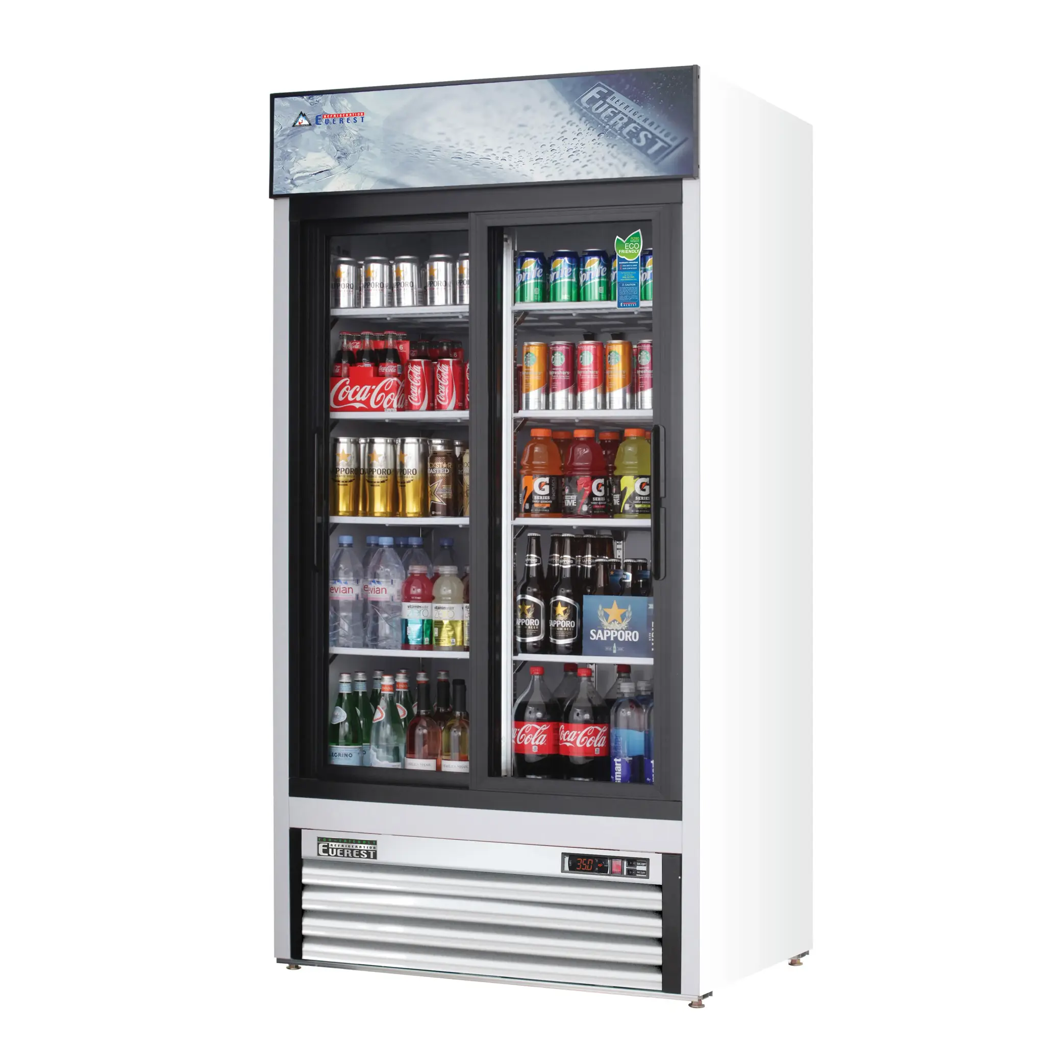 Master your restaurant's kitchen with the Everest Refrigeration EMGR33 Reach-In Glass Door Merchandiser Refrigerator. This two-section refrigerator has a spacious 33.0 cu. ft. capacity, perfect for storing and displaying your culinary creations. With a maximum capacity of 336 20 oz. bottles, this refrigerator is designed to meet the demands of a busy commercial restaurant. The self-contained bottom mounted refrigeration ensures efficient cooling, while the sliding glass self-closing doors provide easy access to your products. The eight epoxy coated wire shelves are height adjustable, allowing you to customize the interior space to suit your needs. The digital controls with LED display make it easy to monitor and adjust the temperature, while the auto defrost feature saves you time and effort. The LED interior lighting with an on/off switch illuminates your products, making them even more enticing to customers. The double-pane glass and white coated steel interior and exterior ensure durability and easy cleaning. With a stainless steel floor and adjustable screw legs, this refrigerator is built to withstand the demands of a commercial kitchen. The R290 Hydrocarbon refrigerant is environmentally friendly, while the 1/3 HP motor provides reliable performance. Trust Everest Refrigeration to deliver high-quality refrigeration solutions for your restaurant.