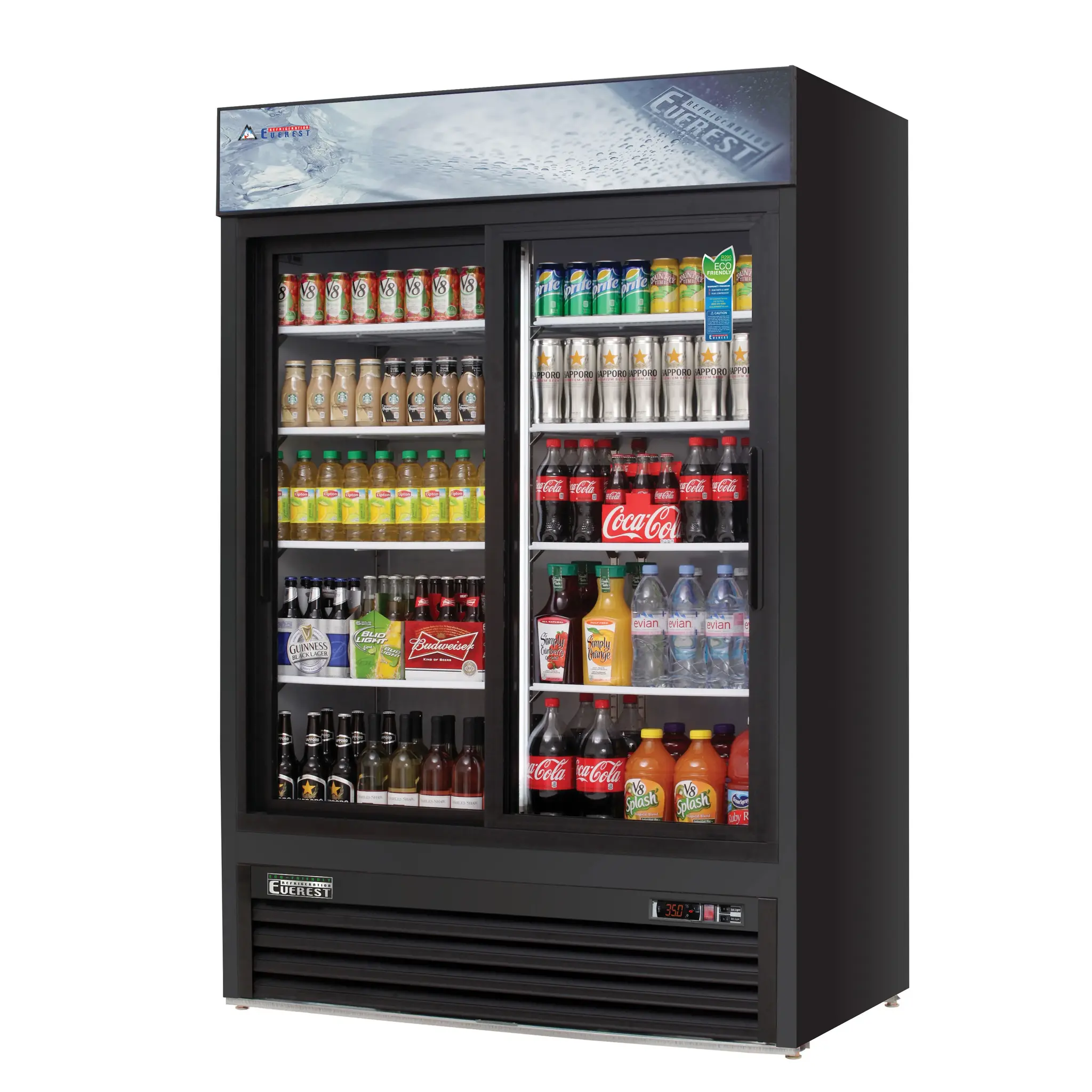Mobilize your kitchen with the Everest Refrigeration EMGR48B Reach-In Glass Door Merchandiser Refrigerator. This two-section refrigerator is designed to meet the needs of commercial restaurants, offering a spacious 48.0 cu. ft. capacity and the ability to hold up to 448 20 oz. bottles. The self-contained bottom mounted refrigeration ensures efficient cooling, while the sliding glass self-closing doors provide easy access to the contents. With eight epoxy coated wire shelves and height adjustable clips, you can customize the interior to suit your needs. The digital controls with LED display make it easy to monitor and adjust the temperature, while the auto defrost feature saves you time and effort. The LED interior lighting with an on/off switch illuminates the contents, making it easy for customers to see what's available. The double-pane glass, black coated steel exterior, and white coated steel interior give this refrigerator a sleek and professional look. The stainless steel floor is durable and easy to clean, ensuring hygiene in your restaurant. With adjustable screw legs, you can easily level the refrigerator on any surface. This refrigerator uses R290 Hydrocarbon refrigerant, which is environmentally friendly. With a 1/2 HP motor and 115v/60/1-ph power supply, this refrigerator is powerful and efficient. The Everest Refrigeration EMGR48B Reach-In Glass Door Merchandiser Refrigerator is NSF and cETLus certified, guaranteeing its quality and safety. Upgrade your restaurant's refrigeration system with this reliable and high-performing refrigerator.