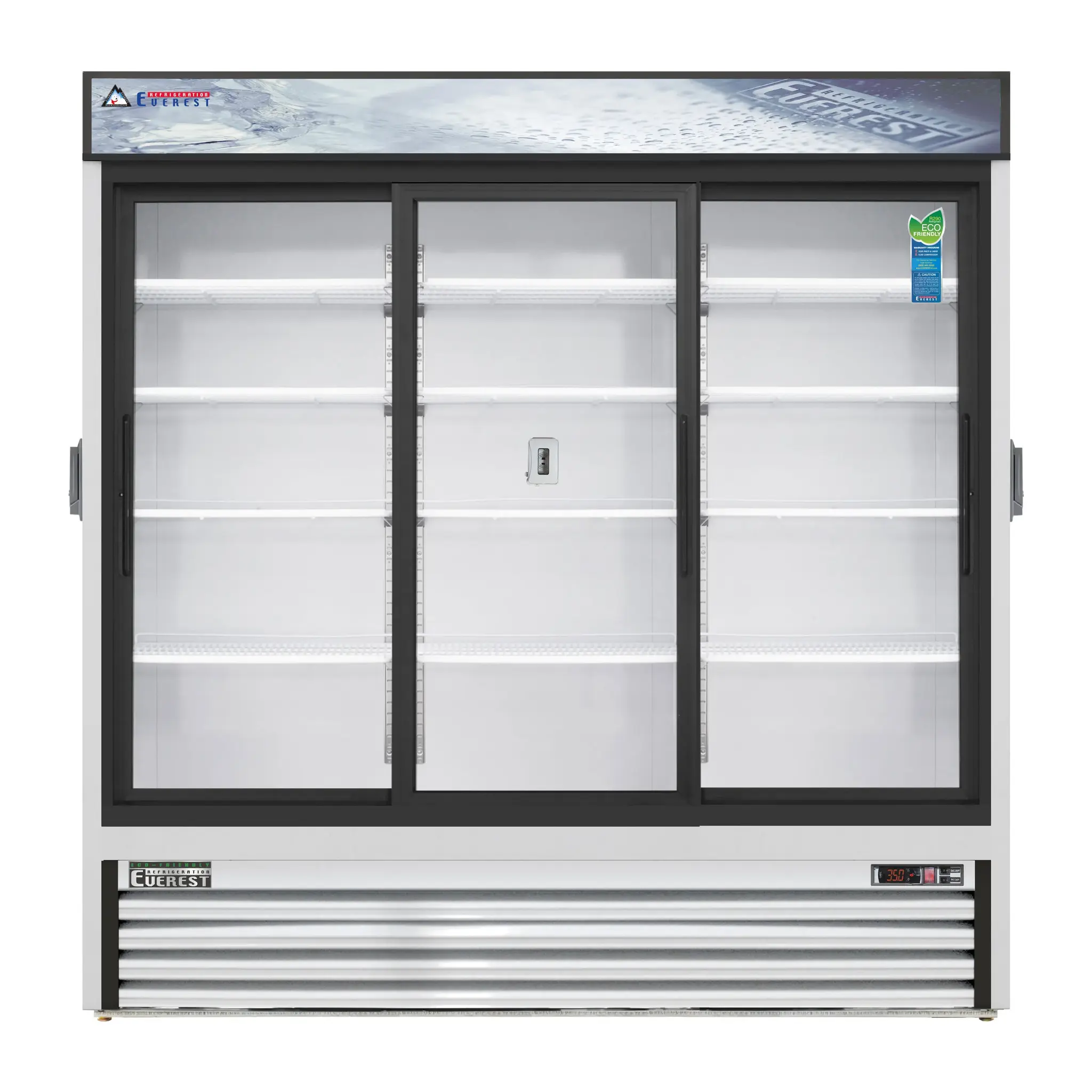 Create culinary magic with the Everest Refrigeration EMGR69C Reach-In Glass Door Chromatography Refrigerator. This three-section refrigerator is designed to meet the needs of commercial restaurants, offering a spacious 69.0 cu. ft. capacity to store all your ingredients and beverages. The self-contained bottom mounted refrigeration ensures efficient cooling, while the three sliding glass self-closing doors provide easy access to your products. With 12 epoxy coated wire shelves and height adjustable clips, you can customize the interior space to suit your needs. The digital controls with LED display allow for precise temperature management, and the auto defrost feature ensures hassle-free maintenance. The LED interior lighting with an on/off switch illuminates the contents, making it easy to find what you need. This refrigerator also features double-pane glass, a white coated steel interior and exterior, and a stainless steel floor for durability and easy cleaning. With its NSF and cETLus ETL-Sanitation certifications, this Everest Refrigeration EMGR69C refrigerator is a reliable and safe choice for any commercial kitchen.