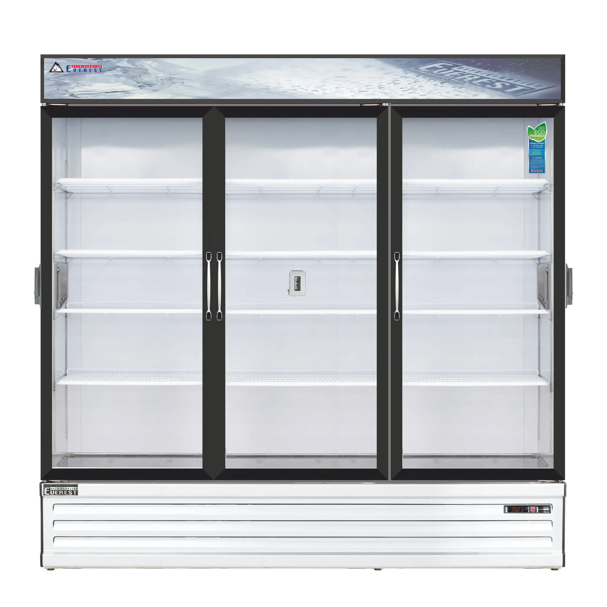 Equip your kitchen for success with the Everest Refrigeration EMSGR69C Reach-In Glass Door Chromatography Refrigerator. This three-section refrigerator is designed to meet the demands of a commercial restaurant, offering a spacious 71.0 cu. ft. capacity to store all your perishable ingredients and beverages. The self-contained bottom mounted refrigeration ensures efficient cooling, while the three glass hinged self-closing doors provide easy access to your products. With 12 epoxy coated wire shelves and height adjustable clips, you can customize the interior space to suit your needs. The digital controls with LED display allow for precise temperature management, and the auto defrost feature saves you time and effort. The LED interior lighting with an on/off switch ensures visibility, and the double-pane glass and white coated steel interior and exterior provide durability and a sleek appearance. With a stainless steel floor and adjustable screw legs, this refrigerator is built to withstand the demands of a busy kitchen. The EMSGR69C also features an interior GFCI outlet and covered access ports for added convenience. Powered by a 3/4 HP compressor and using R290 Hydrocarbon refrigerant, this refrigerator is energy-efficient and environmentally friendly. NSF and ETL-Sanitation certified, this Everest Refrigeration refrigerator is a reliable and safe choice for your commercial restaurant.