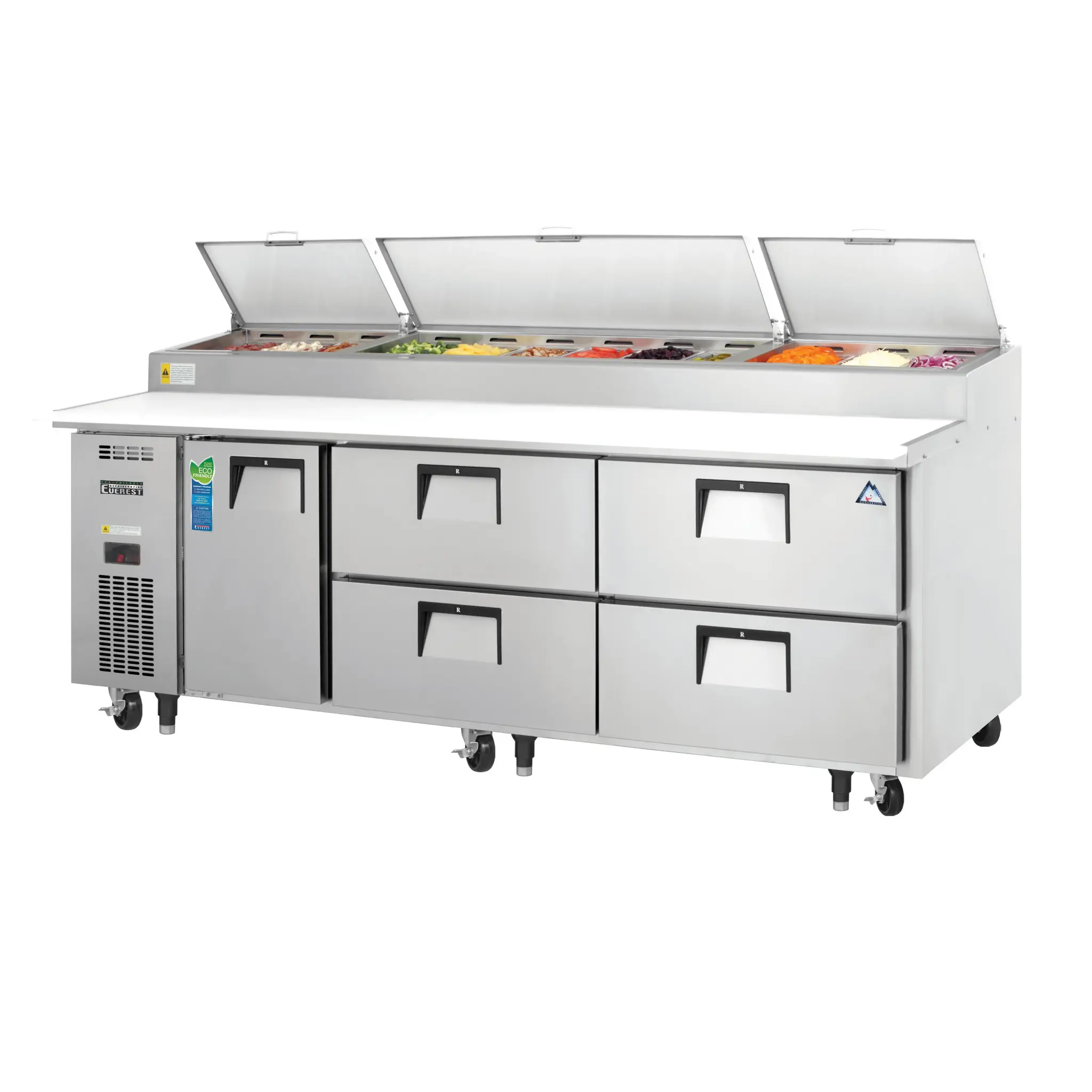 Discover kitchen perfection with the Everest Refrigeration EPPR3-D4 Refrigerated Counter Pizza Prep Table. This three-section table is designed to meet the demands of a busy commercial restaurant kitchen. With a spacious 30.0 cu. ft. capacity, it offers ample storage for all your ingredients and supplies. The stainless steel top features an opening for 12 1/3 size pans, allowing for easy access and organization. The table also includes a 19-1/4" removable cutting board, perfect for preparing pizzas and other dishes. The self-contained side mounted refrigeration ensures optimal temperature control, while the digital controls with LED display make it easy to monitor and adjust settings. The unit is made with high-quality stainless steel, ensuring durability and easy cleaning. With its sleek design and efficient functionality, the Everest Refrigeration EPPR3-D4 is the perfect addition to any commercial kitchen.