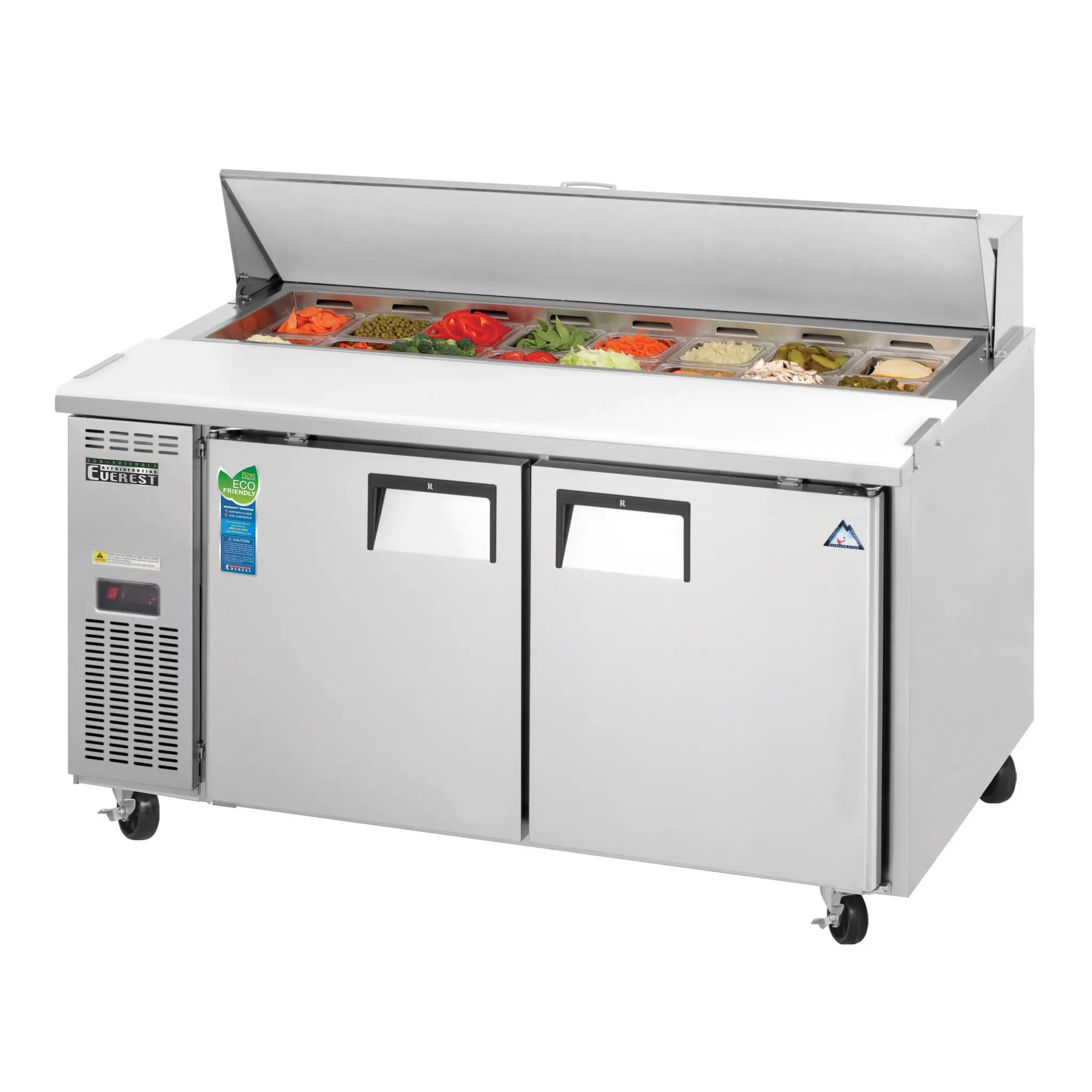Unleash your kitchen's potential with the Everest Refrigeration EPWR2 Refrigerated Counter, Sandwich / Salad Unit. This two-section sandwich prep table is designed to meet the demands of a busy commercial restaurant. With a spacious 17.0 cu. ft. capacity, you'll have plenty of room to store and prepare ingredients for your signature sandwiches and salads. The stainless steel top features an opening for 16 1/6 size pans, allowing for easy access and organization. The unit also includes a 1/2" thick insulated top lid and two solid hinged self-closing doors for maximum efficiency and temperature control. The digital controls with LED display make it easy to adjust and monitor the temperature, while the auto defrost feature ensures hassle-free maintenance. The LED interior lighting illuminates the interior, making it easy to find what you need. With its stainless steel construction and R290 Hydrocarbon refrigerant, this sandwich prep table is not only durable but also environmentally friendly. Trust Everest Refrigeration to deliver high-quality refrigeration solutions for your commercial kitchen.