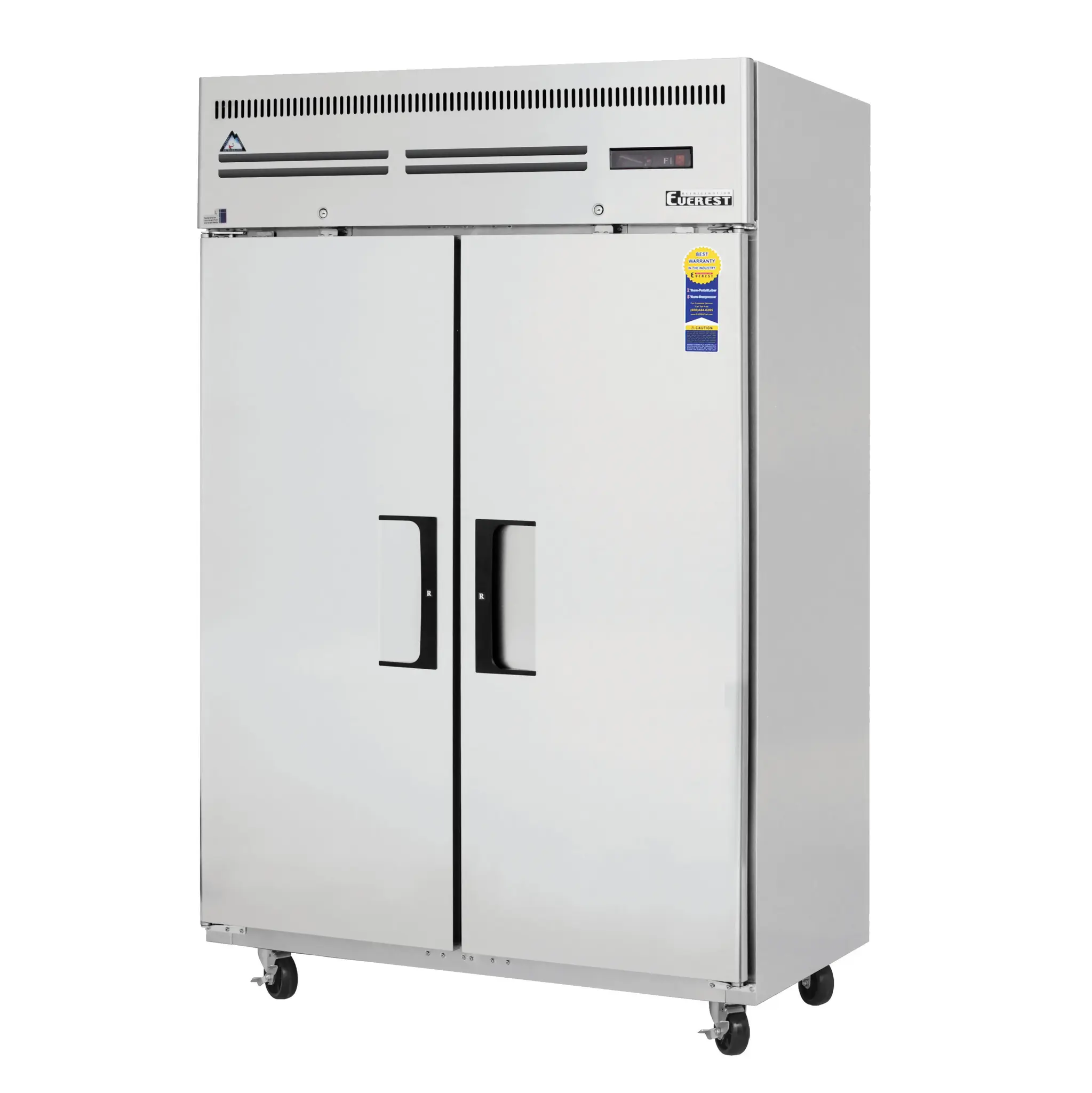 Unleash your kitchen's potential with the Everest Refrigeration ESF2 Reach-In Freezer. Designed for commercial restaurant use, this two-section freezer offers a spacious 48.0 cu. ft. capacity to accommodate all your frozen goods. The self-contained top mounted refrigeration ensures efficient cooling, while the two solid hinged self-closing doors with locking feature provide easy access and security. With six epoxy coated wire shelves and height adjustable clips, you can customize the interior space to suit your needs. The digital controls with LED display allow for precise temperature management, and the auto defrost feature ensures hassle-free maintenance. The LED interior lighting illuminates the stainless steel interior, making it easy to locate items. The stainless steel front and sides, along with the galvanized steel top, bottom, and rear, ensure durability and longevity. Powered by two 1/2 HP motors, this freezer operates on 115v/60/1-ph power and is NSF and ETL-Sanitation certified. Upgrade your kitchen with the Everest Refrigeration ESF2 Reach-In Freezer and experience enhanced efficiency and convenience.