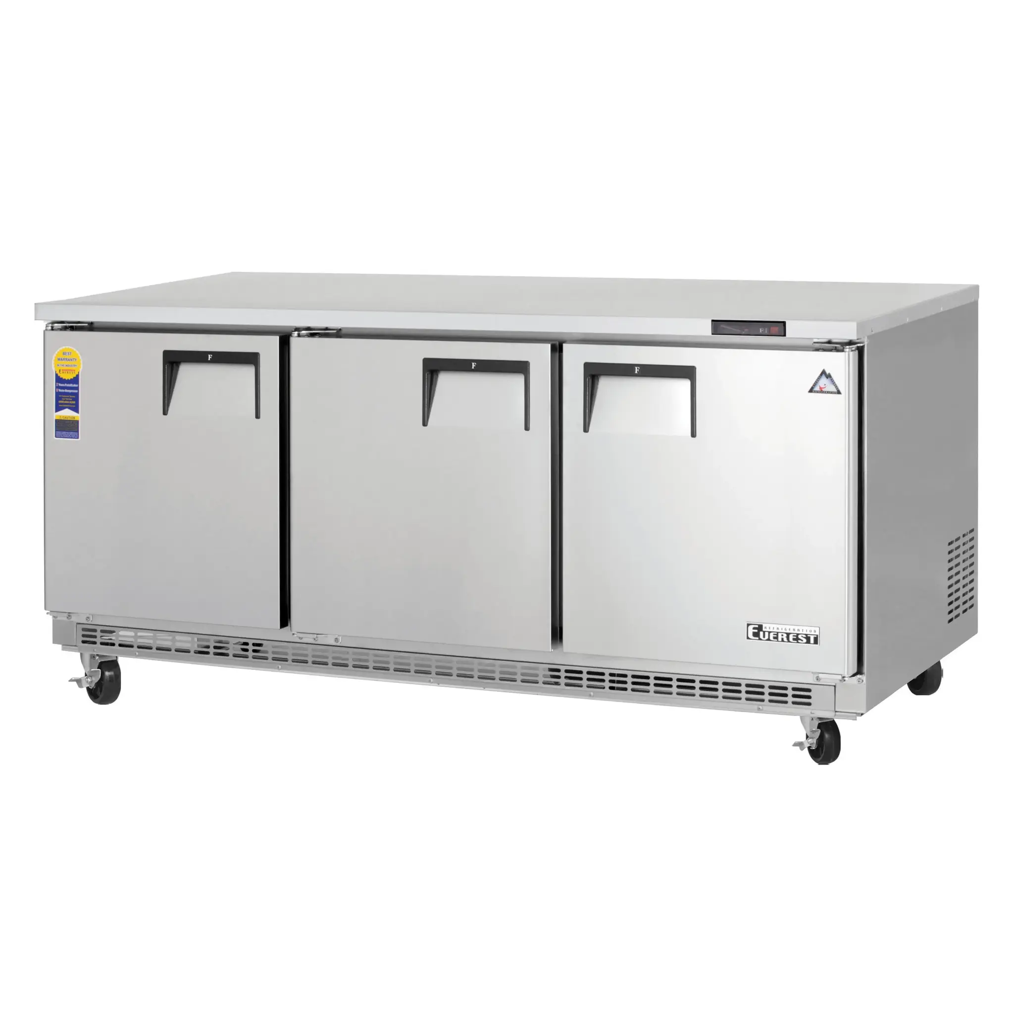 Discover kitchen perfection with the Everest Refrigeration ETBF3 Freezer. This undercounter/worktop freezer is designed to meet the demands of a busy commercial restaurant. With its three-section design and 22.0 cu. ft. capacity, it provides ample storage space for all your frozen ingredients and prepared dishes. The self-contained bottom mounted refrigeration ensures efficient cooling, while the 16 gauge stainless steel worktop offers durability and a sleek appearance. The three solid hinged self-closing doors, equipped with locks, provide easy access and security. Inside, you'll find six epoxy coated wire shelves with height adjustable clips, allowing you to customize the storage space to suit your needs. The digital controls with LED display make it easy to monitor and adjust the temperature, while the defrost cycle with heater ensures optimal performance. With its stainless steel interior, front, and sides, as well as the galvanized steel bottom and rear, this freezer is built to withstand the rigors of a commercial kitchen. Powered by a 1/2 HP motor, this freezer operates quietly and efficiently. NSF and cETLus certified, it meets the highest standards of quality and safety. Upgrade your kitchen with the Everest Refrigeration ETBF3 Freezer and experience the perfect blend of functionality and style.