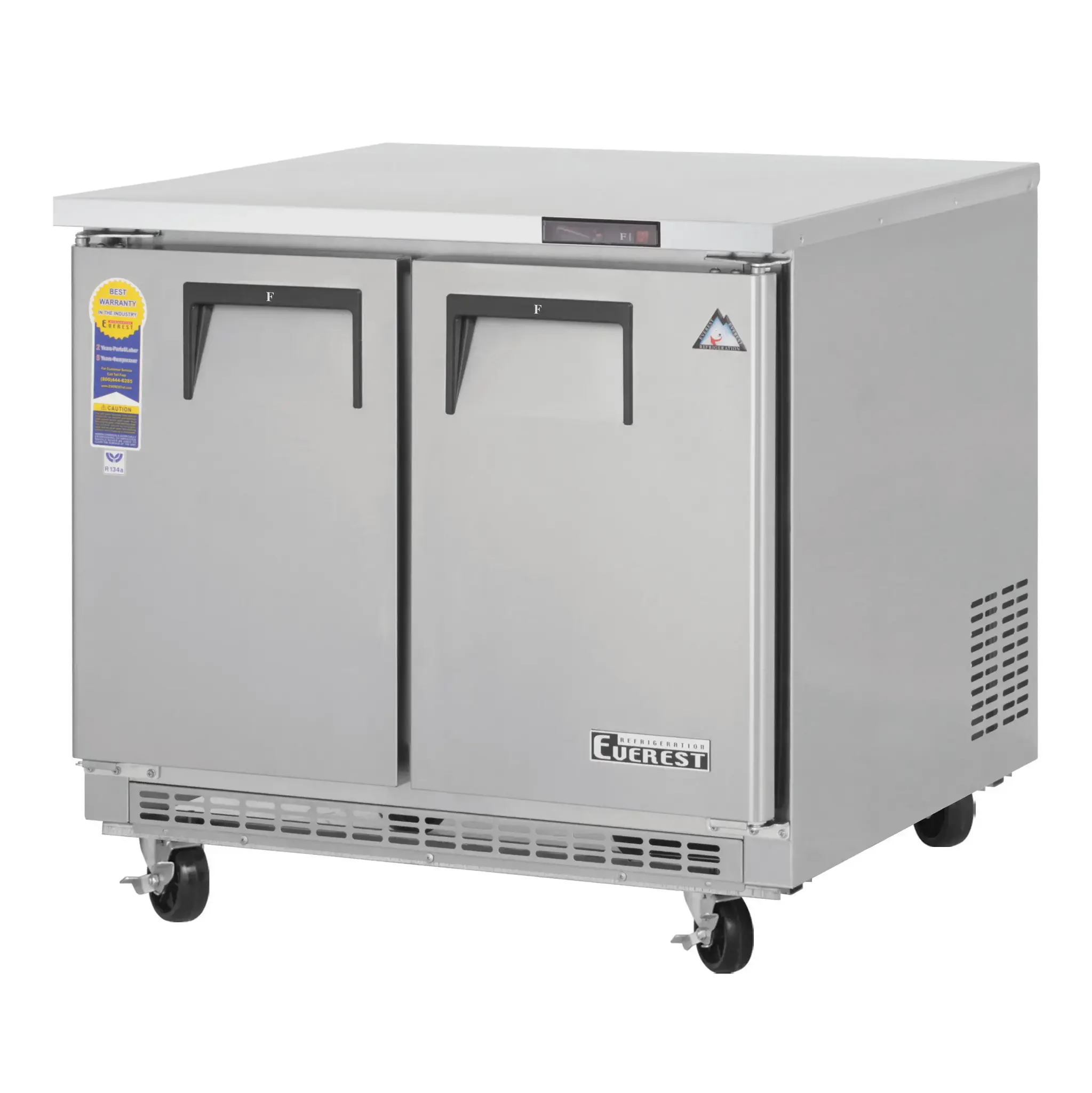 Mobilize your kitchen with the Everest Refrigeration ETBSF2 Freezer. This undercounter/worktop freezer is designed to meet the demands of a busy commercial restaurant. With a spacious 10.0 cu. ft. capacity, it provides ample storage space for your frozen ingredients and prepared dishes. The self-contained bottom mounted refrigeration ensures efficient cooling, while the 16 gauge stainless steel worktop offers durability and a hygienic surface for food preparation. The two solid hinged self-closing doors are lockable, providing added security for your valuable inventory. Inside, you'll find four epoxy coated wire shelves with height adjustable clips, allowing you to customize the storage space to suit your needs. The digital controls with LED display make it easy to monitor and adjust the temperature, while the defrost cycle with heater ensures optimal performance. With its stainless steel interior, front, and sides, as well as a galvanized steel bottom and rear, this freezer is built to withstand the rigors of a commercial kitchen. It uses R290 Hydrocarbon refrigerant, which is environmentally friendly. The 1/3 HP compressor provides reliable cooling power, and the unit operates on 115v/60/1-ph power with a cord and NEMA 5-15P plug. NSF and cETLus certified, as well as ETL-Sanitation listed, this Everest Refrigeration ETBSF2 Freezer is a reliable and efficient choice for any commercial restaurant.