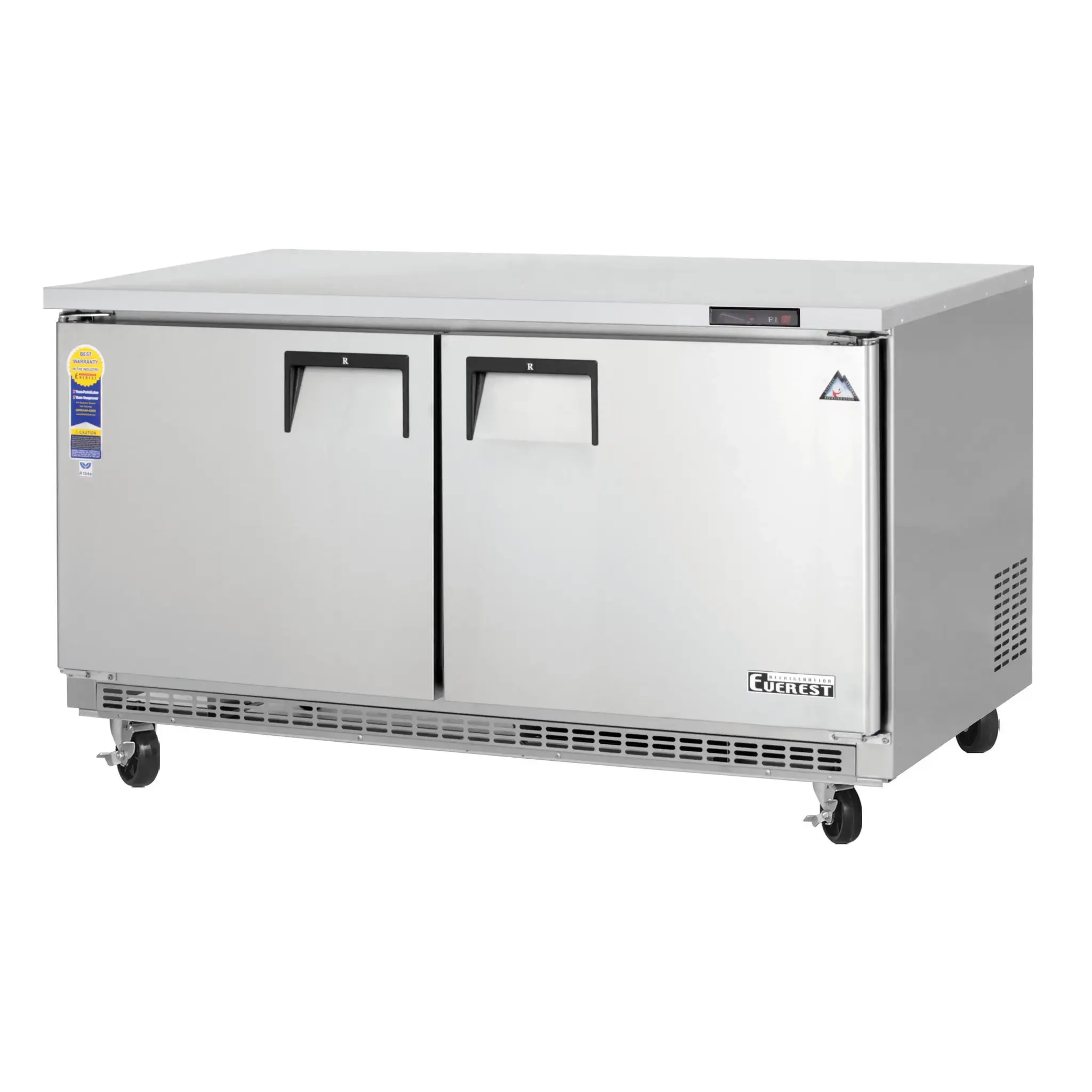 Fuel your restaurant's success with the Everest Refrigeration ETBWF2 Undercounter/Worktop Freezer. This two-section freezer is designed to meet the demands of a busy commercial kitchen. With a spacious 18.0 cu. ft. capacity, you'll have plenty of room to store all your frozen ingredients and prepared dishes. The self-contained bottom mounted refrigeration system ensures efficient cooling and easy maintenance. The 16 gauge stainless steel worktop provides a durable and hygienic surface for food preparation. The two solid hinged self-closing doors are lockable, keeping your valuable inventory secure. Inside, you'll find four epoxy coated wire shelves with height adjustable clips, allowing you to customize the storage space to suit your needs. The digital controls with LED display make it easy to monitor and adjust the temperature. With its front air breathing and pressure relief port, this freezer can be conveniently placed in tight spaces. The stainless steel interior, front, and sides are not only sleek and stylish but also easy to clean. The galvanized steel bottom and rear add to the unit's durability. Powered by a 1/2 HP compressor, this freezer operates quietly and efficiently. It runs on 115v/60/1-ph power and consumes only 5.0 amps. The Everest Refrigeration ETBWF2 Undercounter/Worktop Freezer is NSF and cETLus certified, ensuring its compliance with industry standards for safety and sanitation. Invest in this high-quality freezer and elevate the efficiency and productivity of your restaurant kitchen.