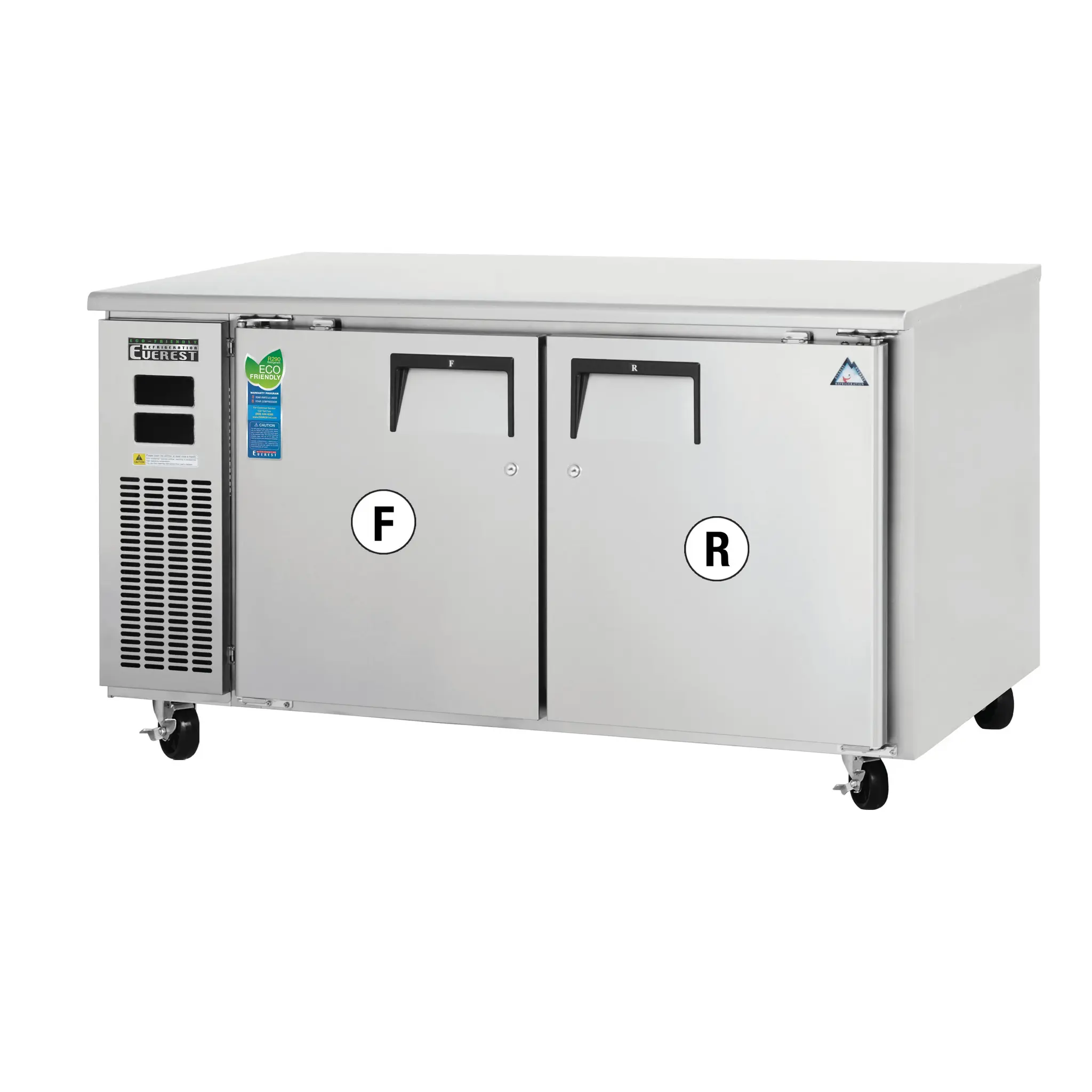 Optimize your kitchen efficiency with the Everest Refrigeration ETRF2 Refrigerator Freezer. This undercounter, dual temperature combo unit is perfect for commercial restaurant use. With a spacious 9.0 cu. ft. capacity for both the refrigerator and freezer sections, you'll have plenty of room to store all your ingredients and frozen goods. The self-contained side mounted refrigeration system ensures consistent cooling performance, while the digital controls with LED display make it easy to adjust and monitor the temperature. The solid hinged self-closing doors, equipped with locks, provide secure storage, and the height adjustable shelves allow for flexible organization. The stainless steel interior and exterior not only give the unit a sleek and professional look but also make it durable and easy to clean. With features like auto defrost in the freezer, LED interior lighting, and a pressure relief port, this Everest Refrigeration ETRF2 Refrigerator Freezer is a reliable and efficient addition to any commercial kitchen.