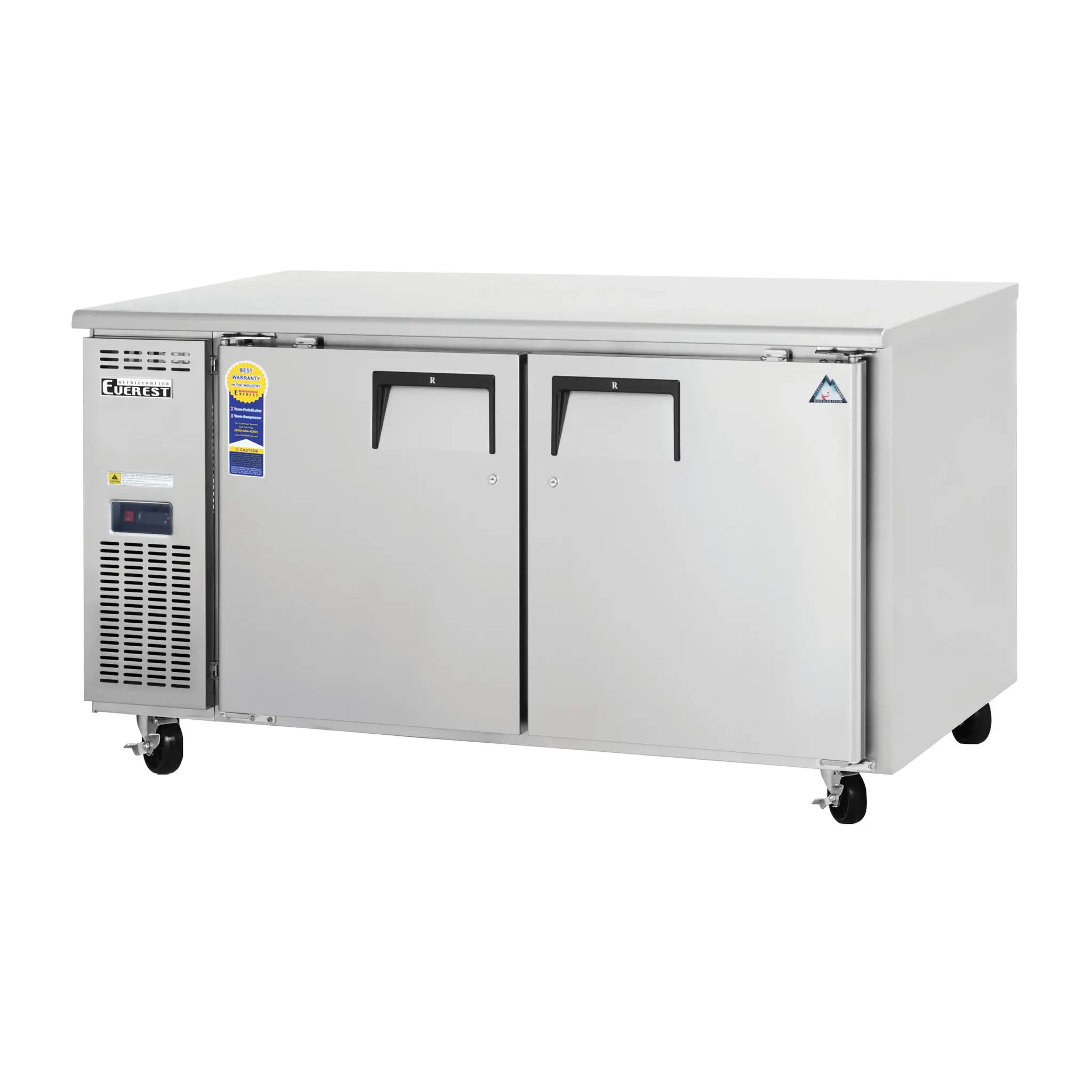 Elevate your dining experience with the Everest Refrigeration ETWF2 Freezer. This undercounter/worktop freezer is designed to meet the demands of a commercial restaurant setting. With a spacious 18.0 cu. ft. capacity, it provides ample storage space for your frozen ingredients and prepared dishes. The two-section design and solid hinged self-closing doors make it easy to organize and access your items. The 16 gauge stainless steel worktop is not only durable but also provides a convenient workspace for food preparation. The digital controls with LED display allow you to easily adjust the temperature, which ranges from -10F to 54F, ensuring optimal food preservation. The auto defrost feature saves you time and effort, while the LED interior lighting illuminates the contents for easy visibility. Made with high-quality materials like stainless steel and galvanized steel, this freezer is built to last. Trust Everest Refrigeration to deliver reliable and efficient refrigeration solutions for your restaurant.
