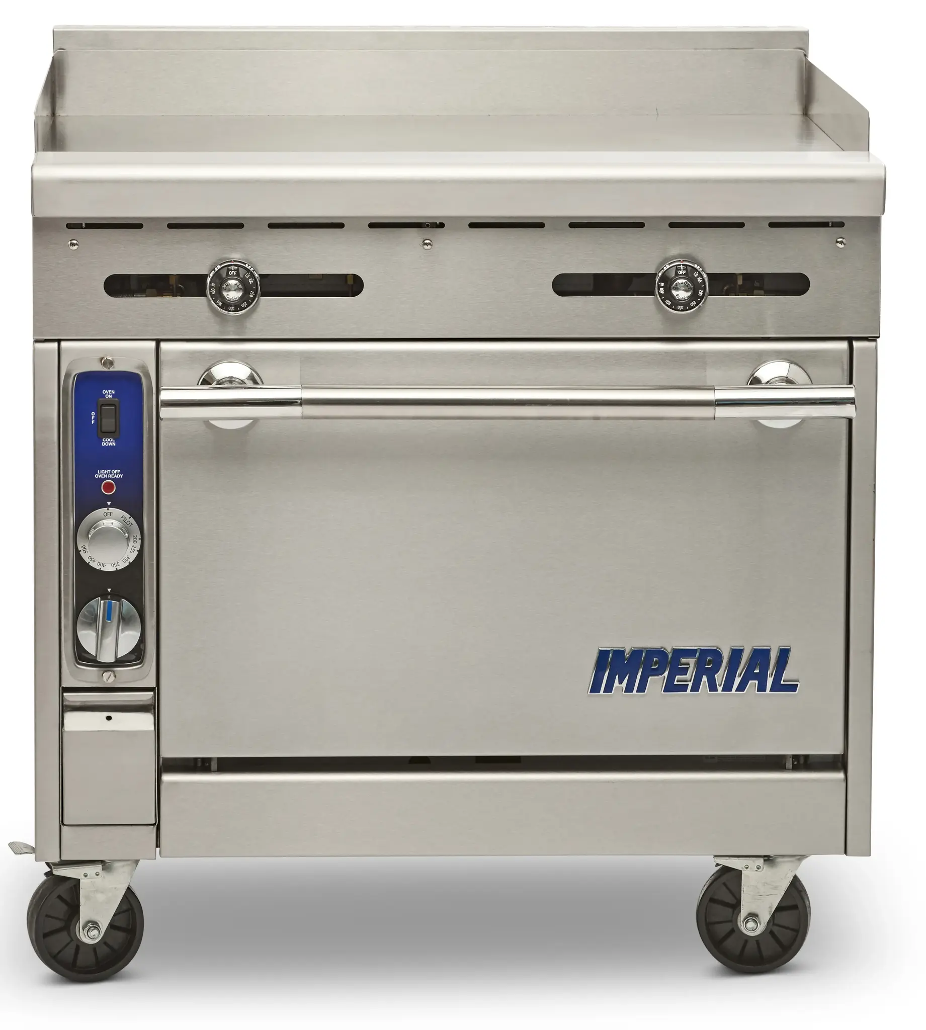 Cook with confidence using the Imperial, IHR-G36-XB Range. This Diamond Series Heavy Duty Range is designed for commercial restaurant use, offering exceptional performance and durability. With a 36" griddle and an open cabinet with a bottom shelf, this range provides ample cooking space and convenient storage for your kitchen essentials. The manual controls allow for precise temperature adjustments, ensuring perfect results every time. The 4"W grease gutter helps to keep your cooking area clean and the stainless steel construction of the front, sides, landing ledge, backguard, and kick plate ensures long-lasting durability. The adjustable feet and 6" legs provide stability and flexibility in any kitchen setup. With a powerful 90000 BTU, this gas range delivers the heat you need to cook your dishes to perfection. Trust in the quality and reliability of Imperial to elevate your restaurant's cooking capabilities.