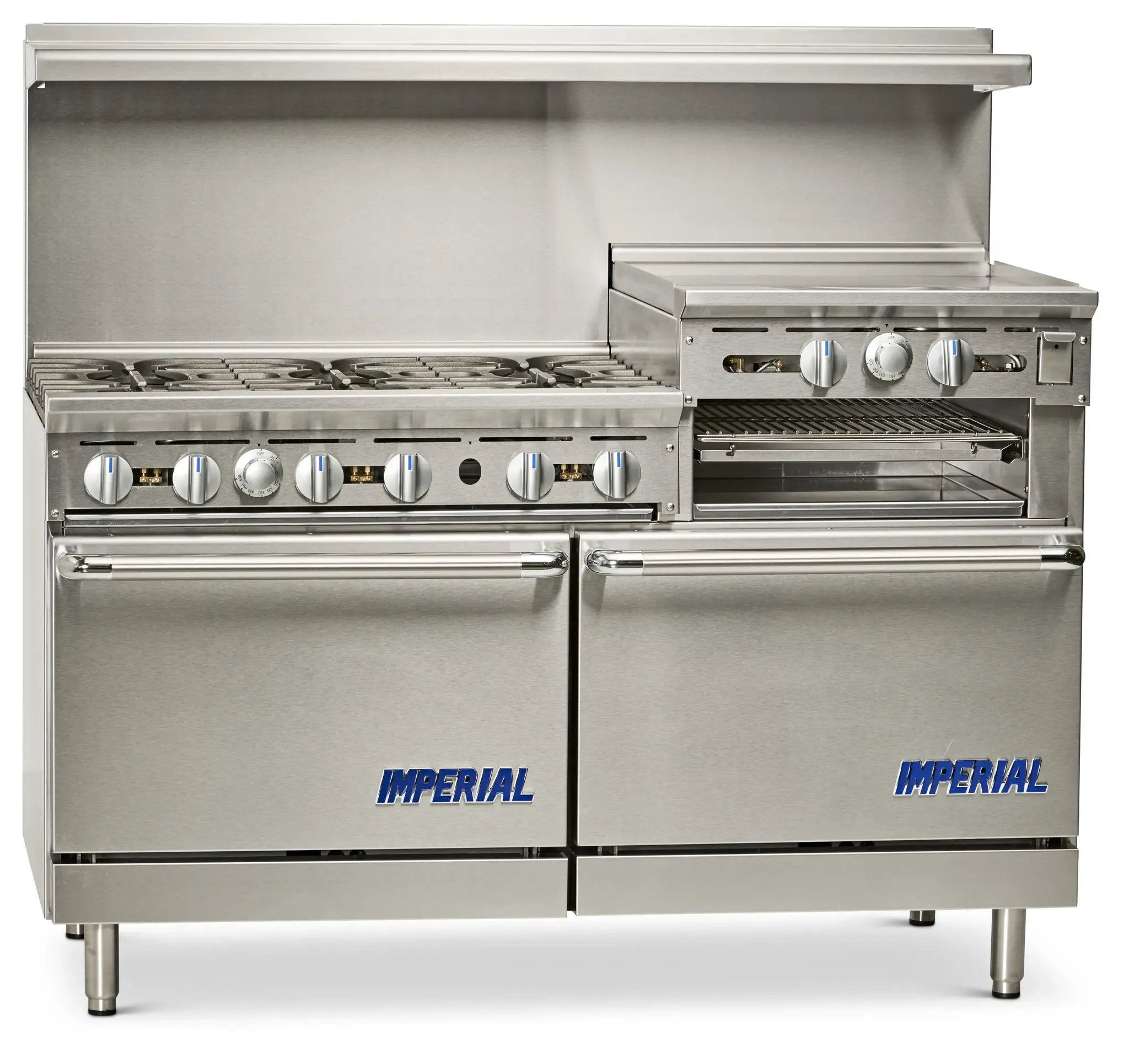 Unleash culinary creativity with the Imperial IR-6-RG24 Range, a versatile and powerful addition to any commercial restaurant kitchen. This gas restaurant range features six open burners, allowing for simultaneous cooking of multiple dishes with precision and efficiency. The 24" raised griddle/broiler provides a convenient space for grilling and broiling, while the two standard ovens offer ample room for baking and roasting. Each oven comes with a chrome rack, ensuring even heat distribution for perfectly cooked meals every time. The stainless steel construction of the front, sides, backguard, shelf, landing ledge, and kick plate not only adds durability but also makes cleaning a breeze. With a 3" grease trough and removable grease can and crumb tray, maintenance is hassle-free. The adjustable feet and 6" legs provide stability and flexibility in any kitchen layout. With a powerful 302,000 BTU, this NSF, CE, CSA Flame, and CSA Star certified range is designed to meet the demands of a busy commercial restaurant. Upgrade your kitchen with the Imperial IR-6-RG24 Range and elevate your culinary creations to new heights.