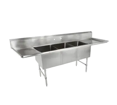 Modernize operations with versatile choices using the John Boos, 3B18244-2D24, Sink, (3) Three Compartment. This stainless steel sink is designed to meet the demands of a busy commercial restaurant. With three 18W x 24 front-to-back x 14 deep compartments, it provides ample space for washing, rinsing, and sanitizing dishes. The two 24 left and right drainboards offer convenient drying areas, while the 10H boxed backsplash with a 45 top and 2 return ensures a clean and hygienic workspace. The sink also features a set of splash mount faucet holes with 8 centers, allowing for easy installation of faucets. Made from durable 16300 stainless steel, this sink is built to withstand the rigors of a commercial kitchen. The adjustable side bracing and bullet feet provide stability and flexibility, while the NSF and CSA-Sanitation certifications guarantee its quality and safety. Upgrade your restaurant's efficiency and cleanliness with the John Boos, 3B18244-2D24, Sink, (3) Three Compartment.
