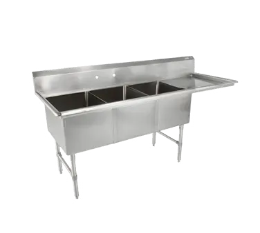 Maximize convenience using efficient tools with the John Boos, 3B244-1D24R, Sink, (3) Three Compartment. This stainless steel sink is designed for commercial restaurant use, offering a spacious and durable solution for all your dishwashing needs. With three 24" x 24" x 14" deep compartments and a 24" right drainboard, this sink provides ample space for washing, rinsing, and drying dishes. The 10" high boxed backsplash with a 45° top and 2" return helps to prevent water splashes and spills, keeping your kitchen clean and safe. The sink also features two sets of splash mount faucet holes with 8" centers, allowing for easy installation of faucets. Made from high-quality 16-gauge stainless steel, this sink is built to withstand the demands of a busy restaurant kitchen. The adjustable side bracing and bullet feet ensure stability and easy leveling. NSF and CSA-Sanitation certified, this John Boos sink is a reliable and efficient addition to any commercial restaurant.