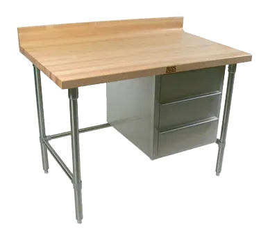 Revitalize operations with flexible choices using the John Boos BT1S01 Work Table, Bakers Top. This versatile table is designed to enhance efficiency and functionality in commercial restaurant settings. Crafted with an antimicrobial Northern Hard Rock Maple top, this table ensures a hygienic food preparation surface. The 1-3/4 inch thick top features a 4-inch coved riser on the back, preventing spills and messes. The penetrating oil finish adds durability and a touch of elegance. The open cabinet base provides convenient storage space, while the three drawers offer easy access to utensils and tools. Stainless steel bracings, legs, and bullet feet ensure stability and longevity. NSF certified, this table meets the highest standards of quality and safety. Whether you need a reliable work surface for baking, prepping, or plating, the John Boos BT1S01 Work Table, Bakers Top is the perfect choice for your restaurant.