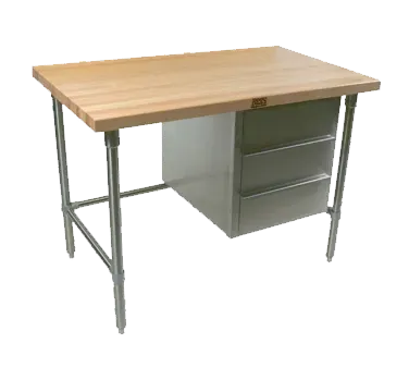 Maximize convenience using efficient tools with the John Boos BTNS03A Work Table. This work table is designed for commercial restaurant use, offering a spacious 84W x 30D x 35-14H overall size to accommodate various tasks. The 1-34 inch thick edge grain top is made of antimicrobial Northern Hard Rock Maple with a penetrating oil finish, ensuring durability and hygiene. The open cabinet base features three drawers, providing ample storage space for utensils, tools, and ingredients. Stainless steel bracings, legs, and bullet feet enhance stability and longevity, making this work table a reliable addition to any busy kitchen. Streamline your restaurant operations with the John Boos BTNS03A Work Table, a versatile and practical solution for your culinary needs.