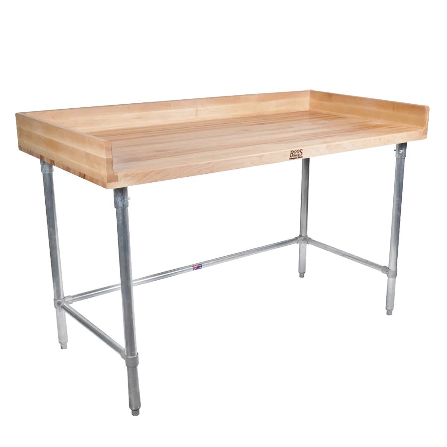 Enhance operations with clever choices using the John Boos DNB13 Work Table, Bakers Top. This versatile work table is designed to meet the demands of a commercial restaurant setting. With its 48W x 36D x 39-14H overall size, it provides ample space for food preparation, making it ideal for busy kitchens. The 1-34 inch thick top with a 4 coved riser on the back and both ends ensures durability and prevents spills from reaching the floor. Made from antimicrobial Northern Hard Rock Maple, this work table promotes a hygienic environment, essential for food safety. The galvanized legs, side, and rear adjustable bracing offer stability and support during heavy-duty use. Equipped with bullet feet, this work table can be easily leveled on uneven surfaces. NSF certified, it meets the highest standards of quality and safety. Upgrade your restaurant's efficiency and functionality with the John Boos DNB13 Work Table, Bakers Top.
