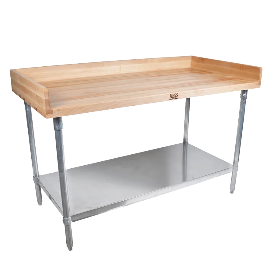 Enhance operations with clever choices using the John Boos DNS14 Work Table, Bakers Top. This versatile work table is designed to optimize efficiency in a commercial restaurant setting. With its generous 60W x 36D x 39-14H overall size, it provides ample space for food preparation, baking, and other culinary tasks. The 1-3/4 inch thick top, made of antimicrobial Northern Hard Rock Maple, ensures durability and cleanliness. The 4 coved riser on the back and both ends prevents spills and messes from spreading. The galvanized adjustable undershelf, legs, and bullet feet offer stability and storage options. NSF certified, this work table meets the highest standards of hygiene and safety. Whether you're kneading dough, chopping vegetables, or assembling ingredients, the John Boos DNS14 Work Table, Bakers Top is a reliable and essential addition to any commercial kitchen.