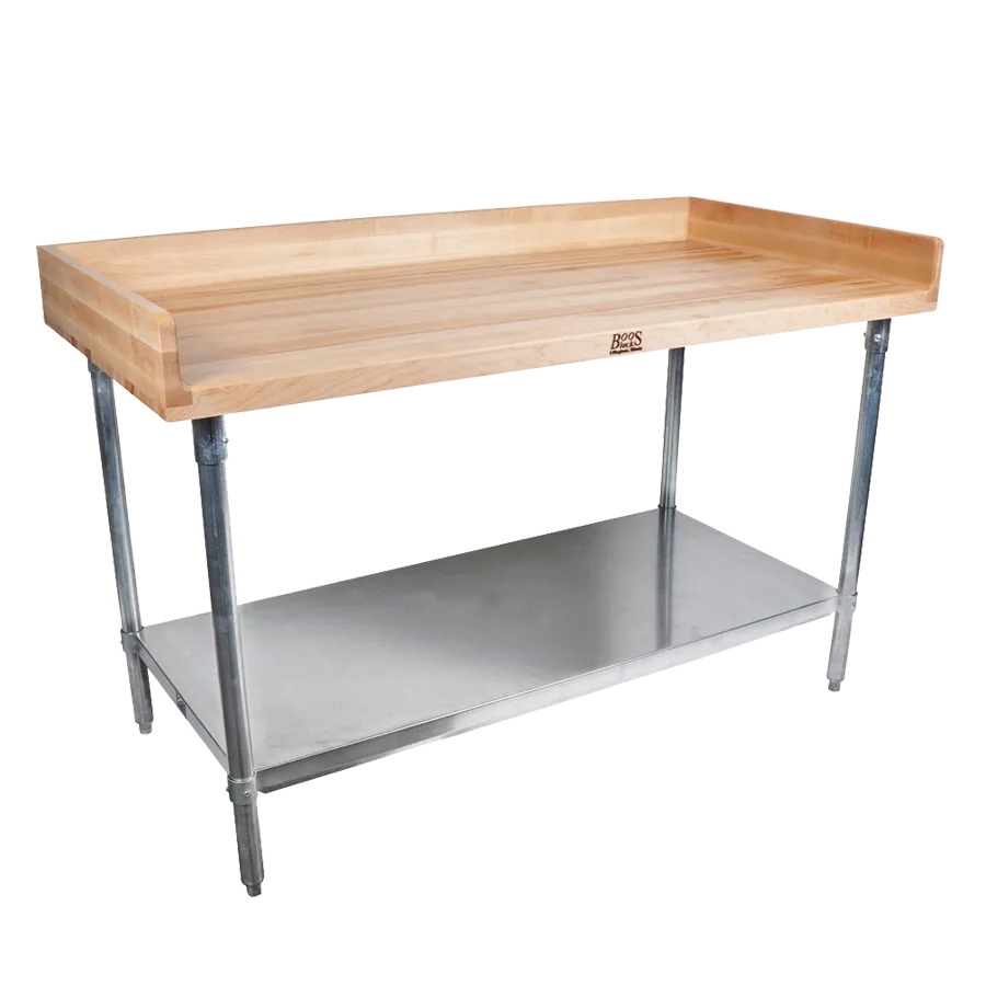 Optimize efficiency with clever solutions through the John Boos DSS02 Work Table, Bakers Top. This versatile work table is designed to enhance productivity in commercial restaurant settings. With a 60W x 24D bakers top, it provides ample space for food preparation, making it ideal for busy kitchens. The 1-3/4 inch thick top with a 4 coved riser on the back and both ends ensures a hygienic and easy-to-clean surface. Made from antimicrobial Northern Hard Rock Maple, this work table helps maintain a clean and safe environment. The adjustable stainless steel undershelf, legs, and bullet feet offer stability and storage options. NSF certified, this work table meets the highest standards of quality and safety. Whether you need a sturdy surface for kneading dough or a reliable workspace for assembling ingredients, the John Boos DSS02 Work Table, Bakers Top is the perfect addition to any commercial kitchen.