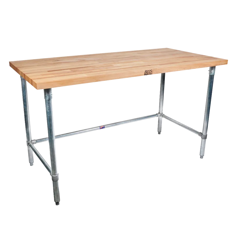 Revitalize service with versatile options through the John Boos TNB04A Work Table with Wood Top. This work table is designed to enhance efficiency and functionality in a commercial restaurant setting. With an overall size of 84W x 24D x 35-34H, it provides ample space for food preparation, plating, and other culinary tasks. The 2-14 inch thick edge grain flat top is made of antimicrobial Northern Hard Rock Maple with a penetrating oil finish, ensuring a hygienic and durable surface. The stainless steel legs offer stability and durability, while the adjustable side and rear bracing allow for customization to suit your specific needs. The bullet feet provide stability and prevent slipping, ensuring a safe working environment. Upgrade your restaurant's efficiency and productivity with the John Boos TNB04A Work Table with Wood Top.