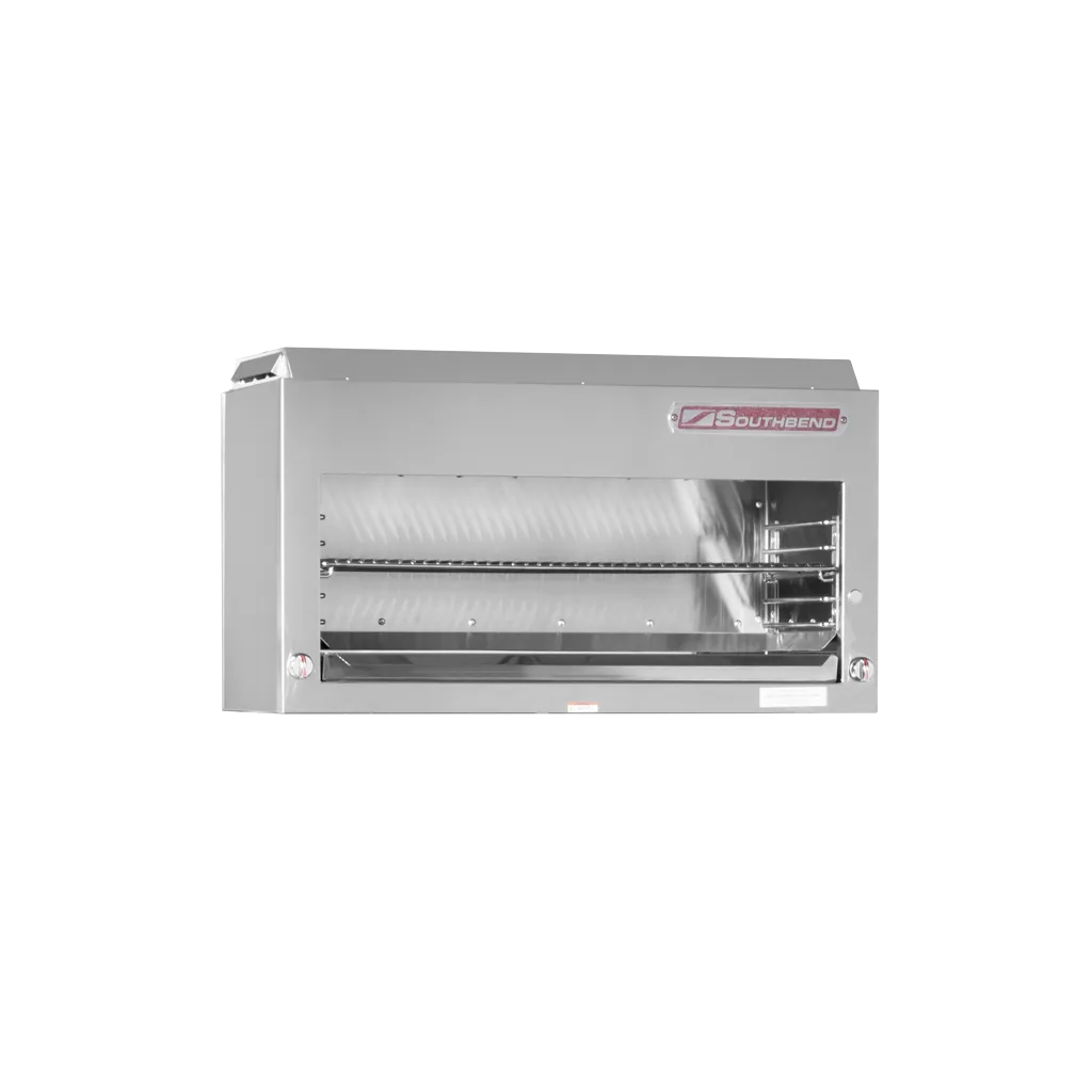 Craft culinary wonders with the Southbend P24-CM Gas Cheesemelter. This platinum heavy-duty cheesemelter is designed to meet the demands of a commercial restaurant kitchen. With its riser mount and stainless steel construction, this cheesemelter is built to last and withstand the rigors of daily use. The two infrared burners provide even heat distribution, ensuring that your dishes are cooked to perfection every time. The five-position rack guides and chrome-plated rack offer versatility and allow you to adjust the height to accommodate different dishes. The dual valve control allows for precise temperature control, while the 90-second preheat time ensures that you can start cooking right away. The removable crumb tray makes cleaning a breeze, saving you time and effort. With a powerful 20,000 BTU, this cheesemelter is NSF and CSA certified, guaranteeing its safety and reliability. Elevate your culinary creations with the Southbend P24-CM Gas Cheesemelter.
