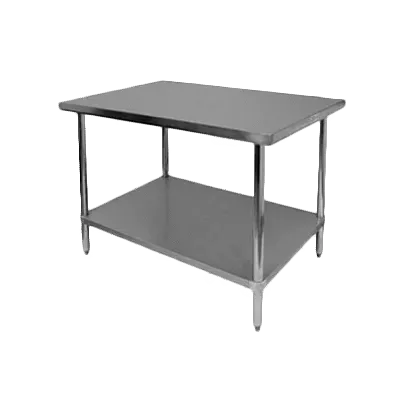 Elevate service with Thunder Group's SLWT43048F Work Table. This stainless steel top table is designed to enhance efficiency and functionality in commercial restaurant settings. With its 18 gauge/430 stainless steel flat top and turn-down edges, this work table provides a durable and easy-to-clean surface for food preparation and other tasks. The galvanized steel adjustable undershelf and legs offer additional storage space and stability, while the 1" adjustable plastic bullet feet ensure level positioning on any surface. Thunder Group's SLWT43048F Work Table is NSF certified, guaranteeing its quality and suitability for use in professional kitchens. Whether you need a sturdy work surface for chopping vegetables or a convenient storage solution for kitchen essentials, this work table is a reliable choice. Trust Thunder Group to deliver the durability and functionality your restaurant needs.
