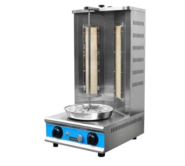Ensure durability and reliability with the Uniworld Foodservice Equipment VBR-2SP Vertical Broiler (Gyro). Designed for commercial restaurant use, this gas-powered vertical broiler is a must-have for any establishment looking to serve delicious gyro dishes. With its stainless steel body and robust construction, this broiler is built to withstand the demands of a busy kitchen. The two burners with independent controls allow for precise heat adjustment, ensuring perfectly cooked meat every time. The electric motor with an on/off switch effortlessly rotates the skewer, evenly cooking the meat and creating that signature gyro texture. The skewer support can hold more than 35 lbs. of meat, making it ideal for high-volume operations. With a powerful 40,000 BTU output and a 2.5 R.P.M. rotation speed, this broiler delivers consistent and efficient performance. Trust Uniworld Foodservice Equipment for all your commercial kitchen needs.