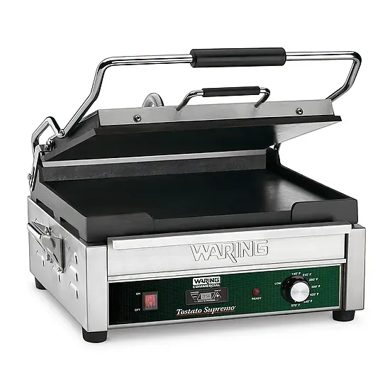 Mobilize your kitchen with the Waring WFG250T Sandwich/Panini Grill. This electric grill is designed to meet the demands of a commercial restaurant, offering a large toasting surface of 14-1/2" x 11". The hinged auto-balancing top plate with heat resistant handles ensures even cooking and easy operation. The flat cast iron plates provide excellent heat distribution and retention, while the adjustable thermostats allow you to achieve the perfect temperature up to 570 F (300 C). With indicator lights and a timer, you can easily monitor and control the cooking process. The brushed stainless steel body and removable drip tray make cleaning a breeze. This grill operates on 120v/60/1-ph and has a 15.0 amp power rating. UL and NSF certified, the Waring WFG250T is a reliable and efficient addition to any commercial kitchen.
