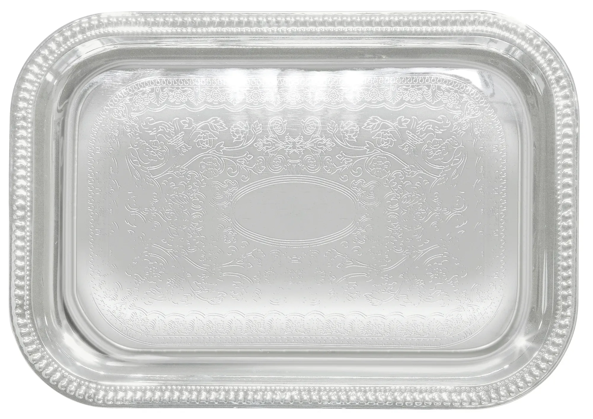 Unlock new culinary possibilities with the Winco Serving Tray. This elegant 20 x 14 rectangular tray is designed to elevate your restaurant's presentation with its sophisticated gadroon edge and traditional engraving. Crafted with a chrome-plated finish, the Winco Serving Tray not only adds a touch of class to your service but also ensures durability and longevity.