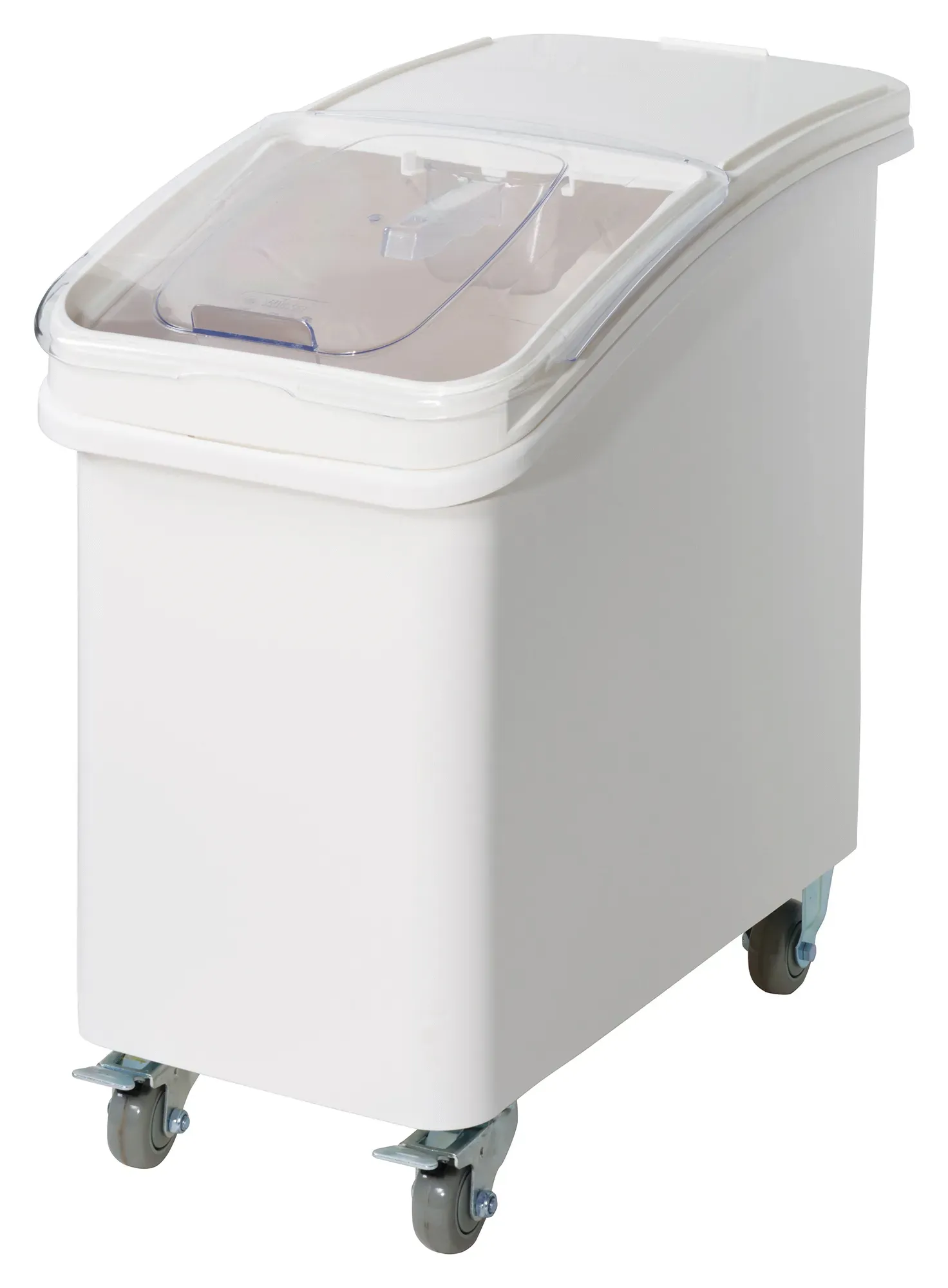 Ideal mobile bulk storage for the kitchen with space-efficient under-counter height. Advanced super-clasp slanted lid design easily slides open to scoop ingredients; when closing, lid slides over the bin edge to reduce possible debris on the lid from falling in. Quickly view contents through the clear cover to identify ingredient and manage inventory. Equipped with four 3" caster wheels (2 fixed & 2 swivel w/brakes) for easy mobility.