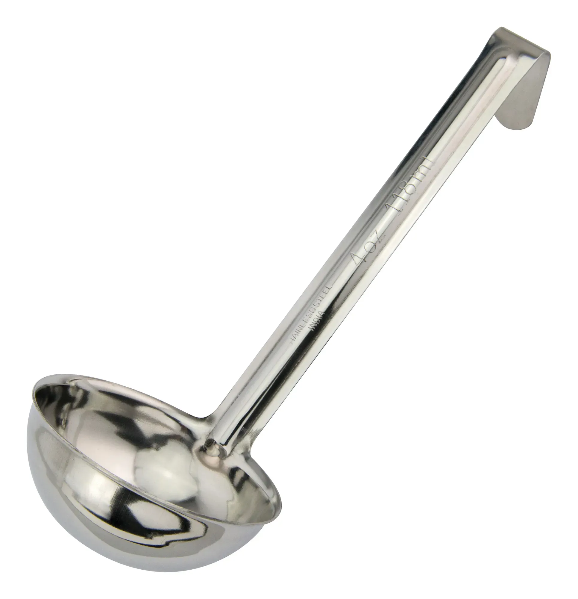 With a 4 oz. capacity, this ladle is perfect for portioning soups, sauces, and dressings with precision, ensuring consistency in every serving. The 6-inch handle provides a comfortable grip, allowing for effortless scooping and pouring, even during the busiest service hours. Its one-piece construction eliminates the risk of food particles getting trapped, promoting better hygiene and simplifying maintenance.