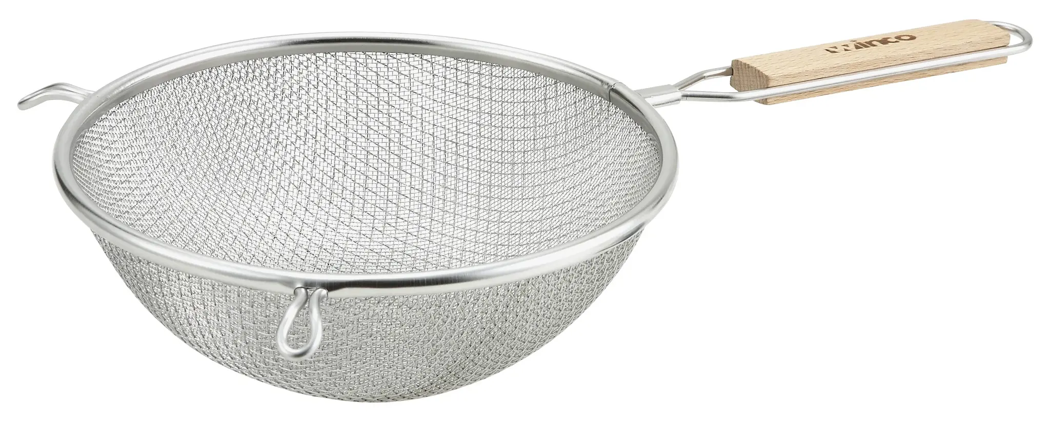 Crafted with a round double fine mesh, the Winco Strainer guarantees superior filtration, ensuring that even the smallest particles are caught, resulting in a smooth and refined end product. The flat wooden handle not only provides a comfortable grip but also adds a touch of elegance to your kitchen tools. Its sturdy construction ensures durability, allowing it to withstand the rigors of daily use in a high-paced environment.