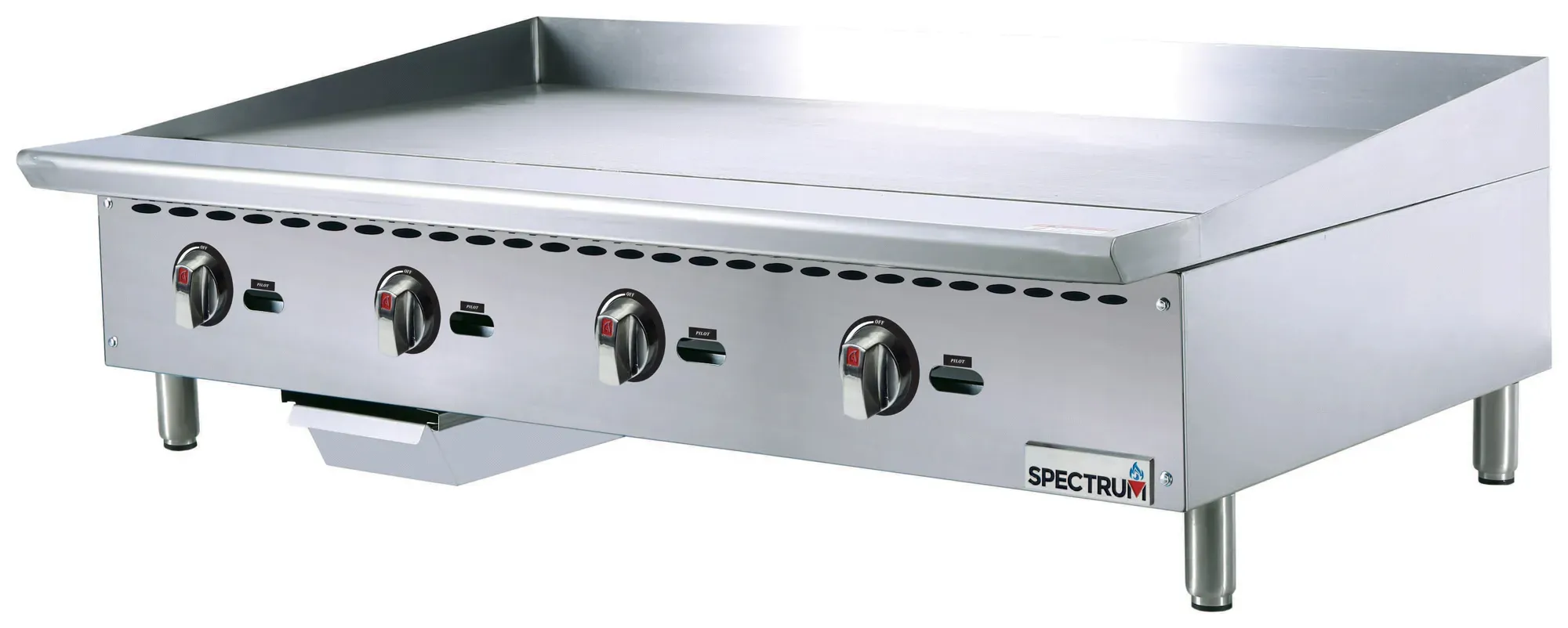 The Spectrum Griddle features powerful 30,000 BTU burners with infinite heat controls, allowing chefs to achieve precise cooking temperatures for a variety of dishes. The standing pilot light ensures quick ignition, while the 3/4 inch polished steel plate guarantees even heat distribution across the entire surface.