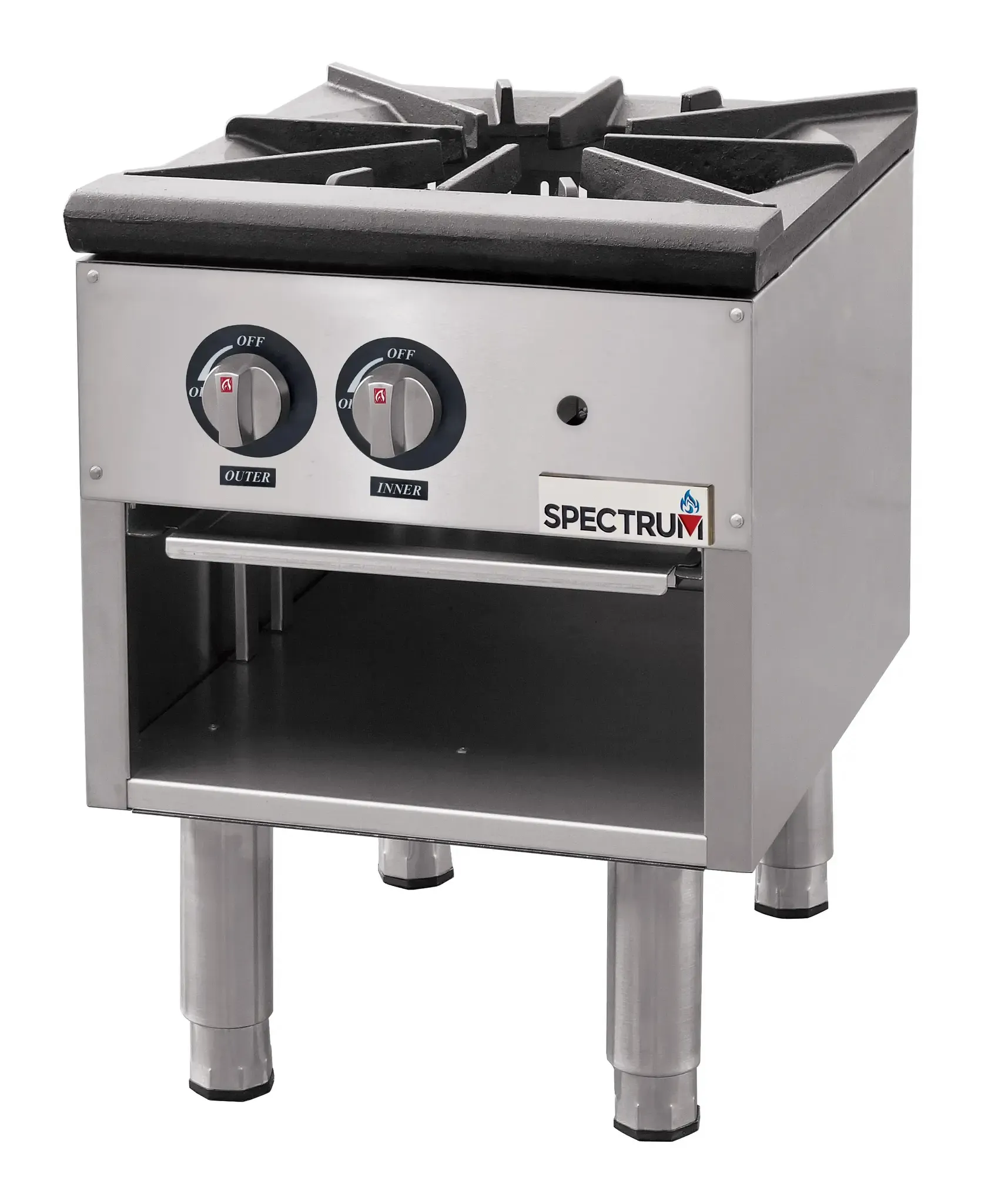 The Spectrum Stock Pot Stove is designed for both efficiency and durability. Its full-width removable stainless steel drip pan ensures easy cleaning and maintenance, while the dual infinite heat controls provide precise temperature management for a variety of cooking needs. The 34 rear gas connection with regulator and standing pilot ignition system ensures reliable and safe operation, making it a dependable choice for busy kitchens.