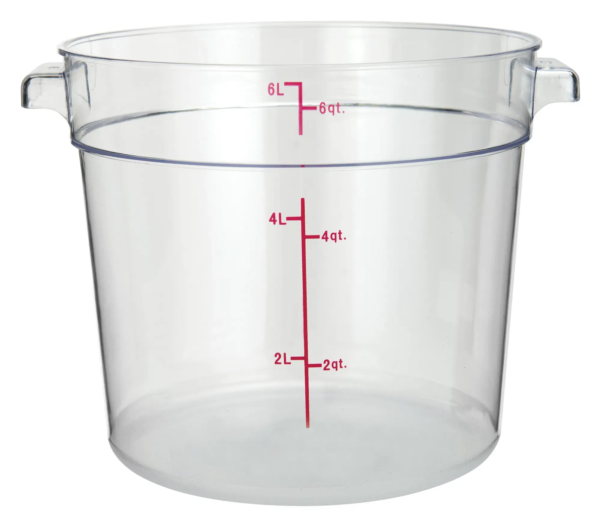 The clear design of the Winco 6qt Round Storage Container allows for easy identification of contents, reducing the time spent searching for ingredients and ensuring that your kitchen runs smoothly. Its durable polycarbonate construction ensures that it can withstand the rigors of a busy restaurant environment, providing long-lasting use and reliability.