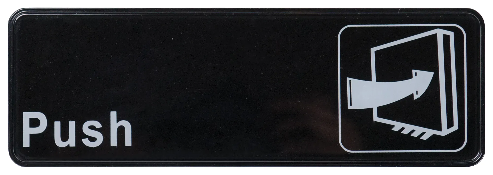 A kitchen essential using the Winco Information Sign with symbol, this 9 x 3H Push white imprint on black sign is a must-have for any restaurant setting. Designed to clearly communicate essential information, this sign ensures that both staff and customers can easily identify push doors, enhancing the overall efficiency and safety of your establishment.