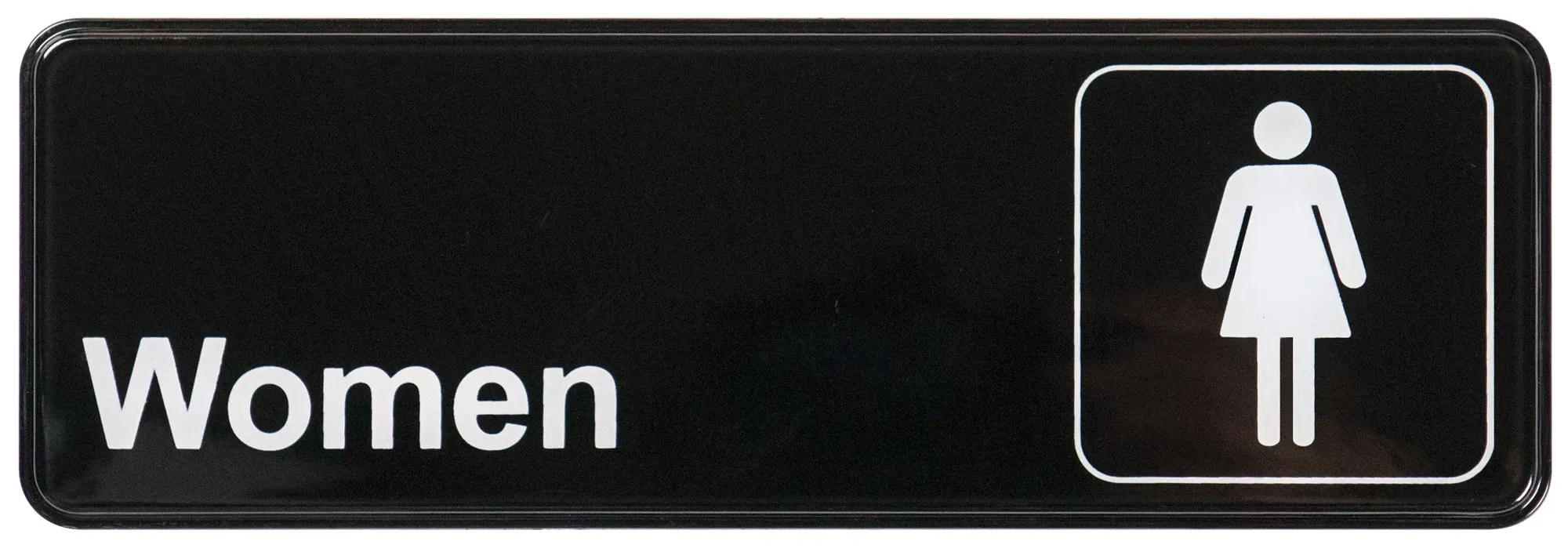 A kitchen essential using the Winco Information Sign, this SGN-312 model is designed to enhance the organization and clarity of your restaurant's facilities. Measuring 9 x 3 inches, this sign features a clear and easily recognizable symbol for women, with a white imprint on a black background. This high-contrast design ensures that the sign is easily visible, even from a distance, making it an ideal addition to any restaurant setting.
