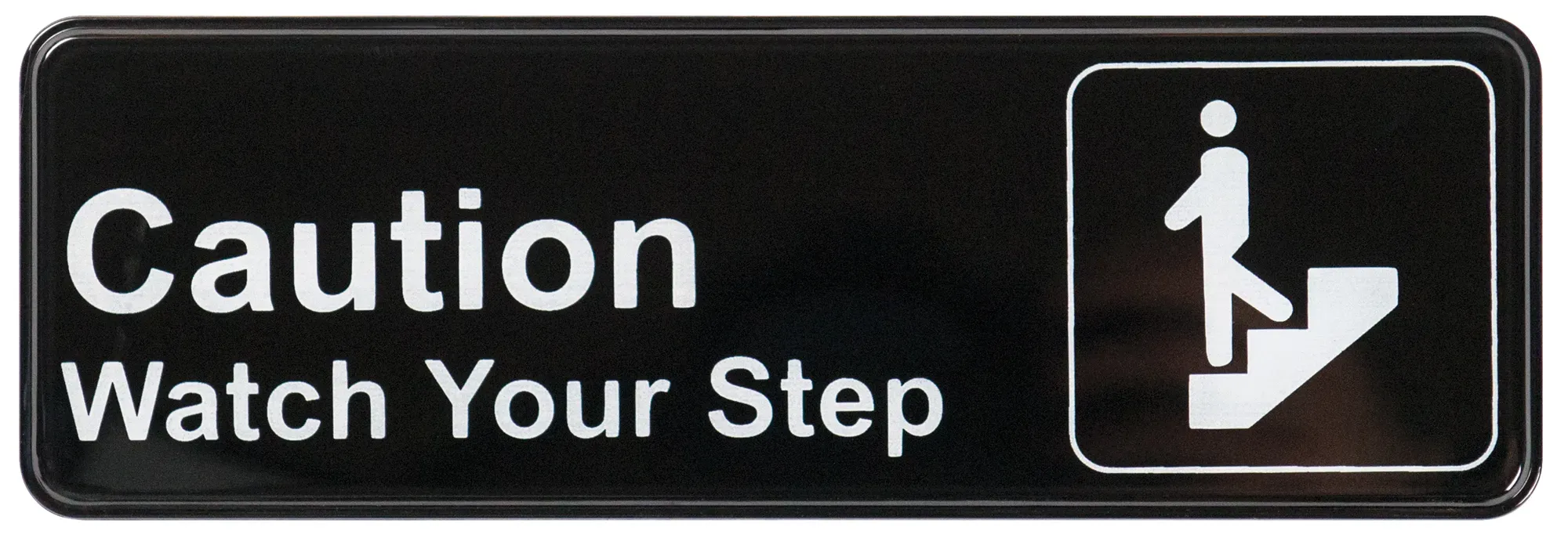 Built for precision and longevity with the Winco Information Sign, this essential safety tool is designed to enhance the safety and efficiency of your restaurant environment. The sign, model SGN-326, features a clear and concise message: "Caution: Watch Your Step," imprinted in white on a durable black background. Measuring 9 inches by 3 inches, this sign is the perfect size to catch the attention of both staff and patrons without being obtrusive.