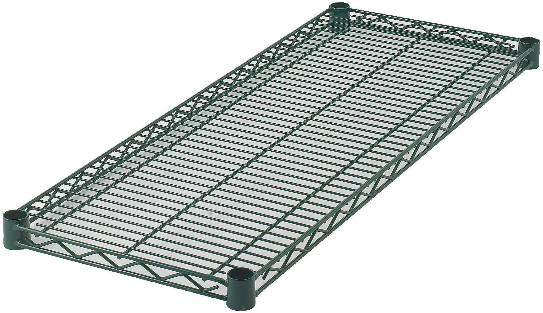 The wire construction of the Winco VEX-1436 Shelf is epoxy coated in green, offering both durability and a sleek, professional appearance. This coating not only enhances the shelf's longevity but also makes it easy to clean, maintaining a hygienic environment that is crucial in any food service setting. The NSF certification further guarantees that this shelf meets strict public health and safety standards, giving you peace of mind.